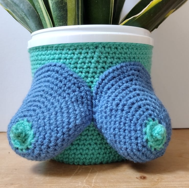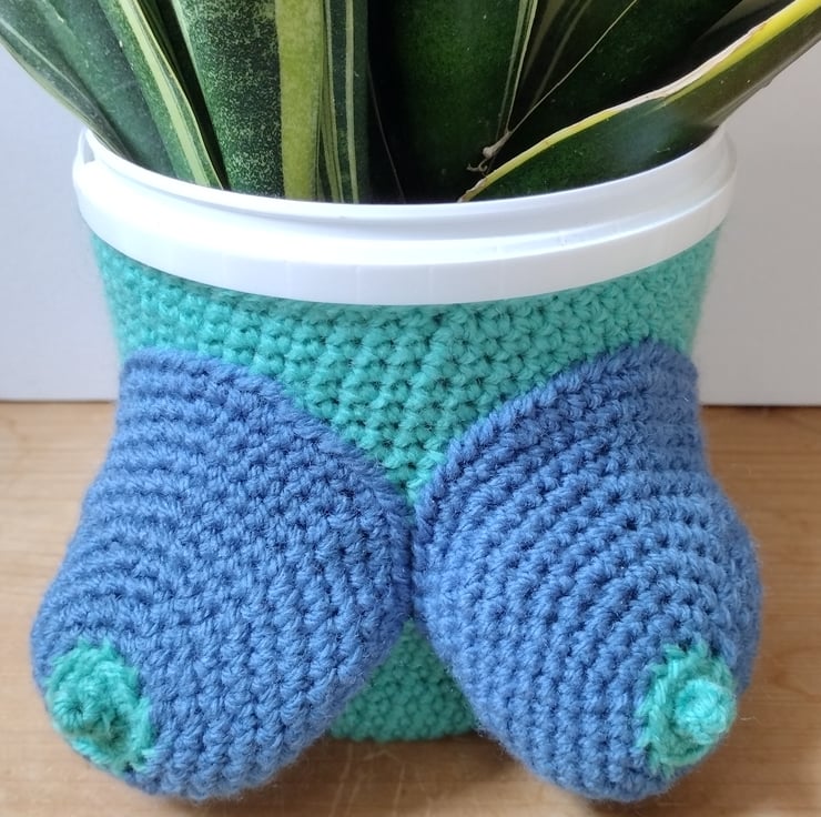 Crocheted plant pot cover adorned with boobs, handmade by me (adapted from Not Your Nana's Yarnwork's pattern).