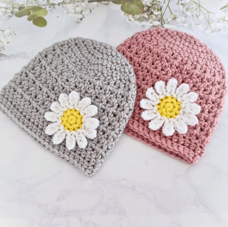 Crochet Baby Beanie with Daisy – Handmade Baby Hat in Sizes Newborn to 2 Years