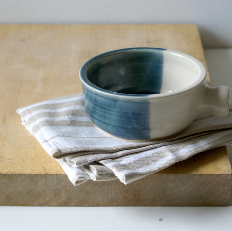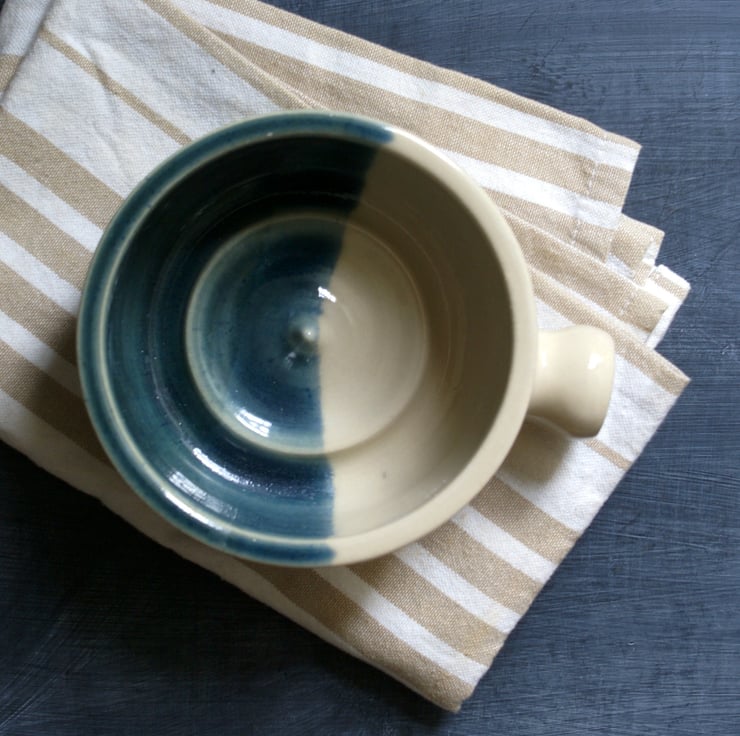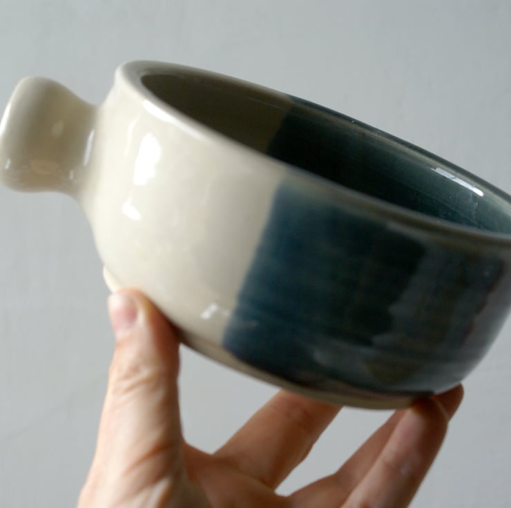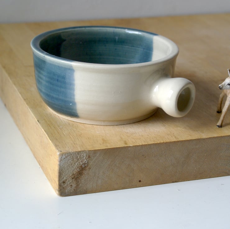 Designed for both functionality and aesthetics this shaving bowl features a wide shallow shape with point in the centre and a ripple edge for lathing your favourite shaving cream. The outside has a knob handle for hooking your thumb around providing stability during your grooming session. There’s a turned foot ring on the bottom and the little wren pottery stamp marking it out as a handmade item. This bowl has been cross-dipped in a glossy transparent and ice blue to add an accent of colour. Treat yourself or a loved one to this practical shaving bowl.