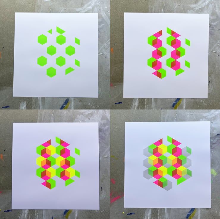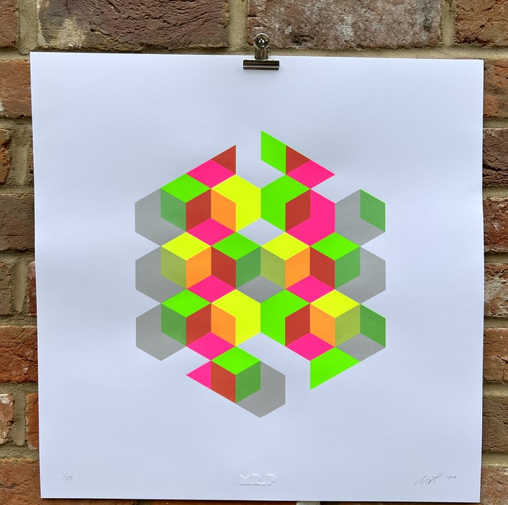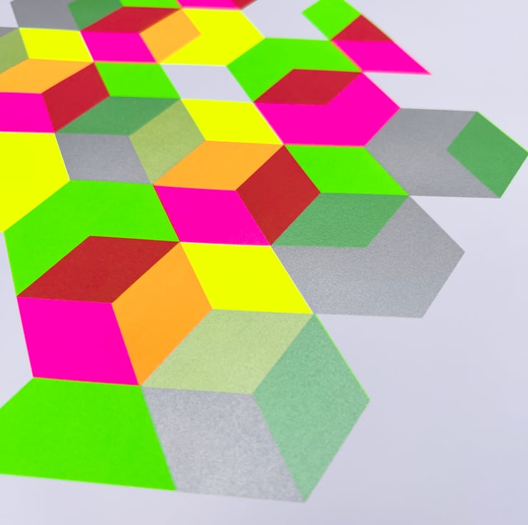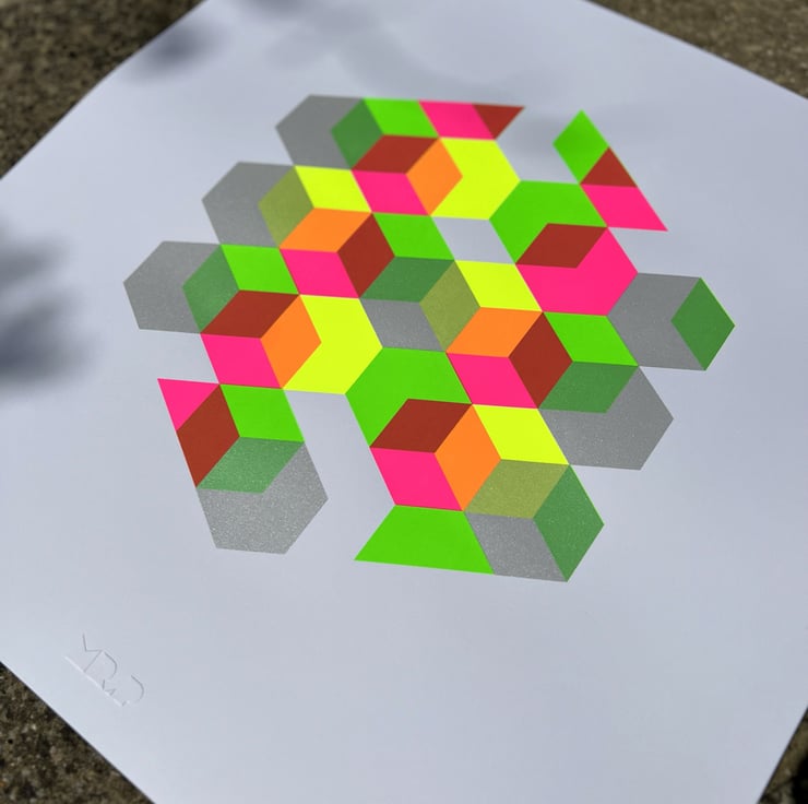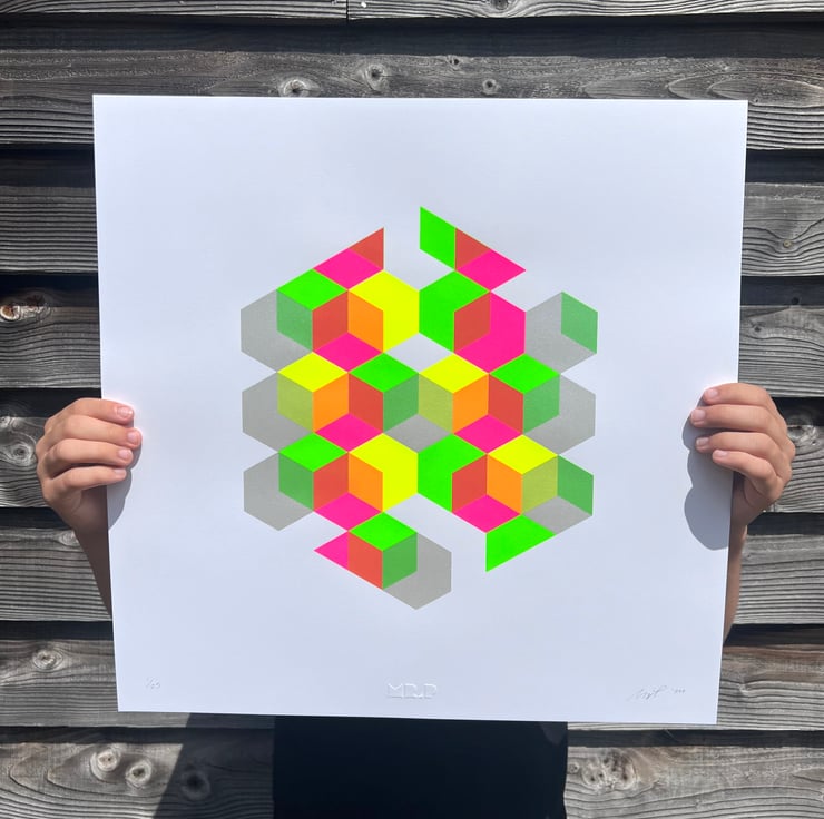'Hex' handmade geometric screen print, designed and hand-printed by me, Mr. P. It features four layers of overlayed fluoro green, pink, yellow and metallic silver hexagonal shapes. Each overlay creates a further colour, for example the yellow and pink combine to create and equally bright orange. Limited edition of 25 and printed on high quality Fabriano 5 300gsm cotton paper. Numbered signed and embossed. Made with lots of love and care in sunny Wandsworth!