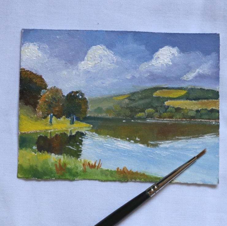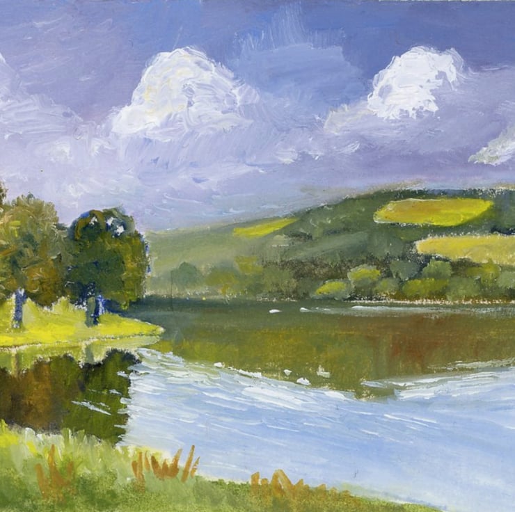 My subject here is a tranquil lake, inspired by a visit to a Scottish loch in south-west Scotland; a patchwork of hills in the distance reflecting into rippled waters.