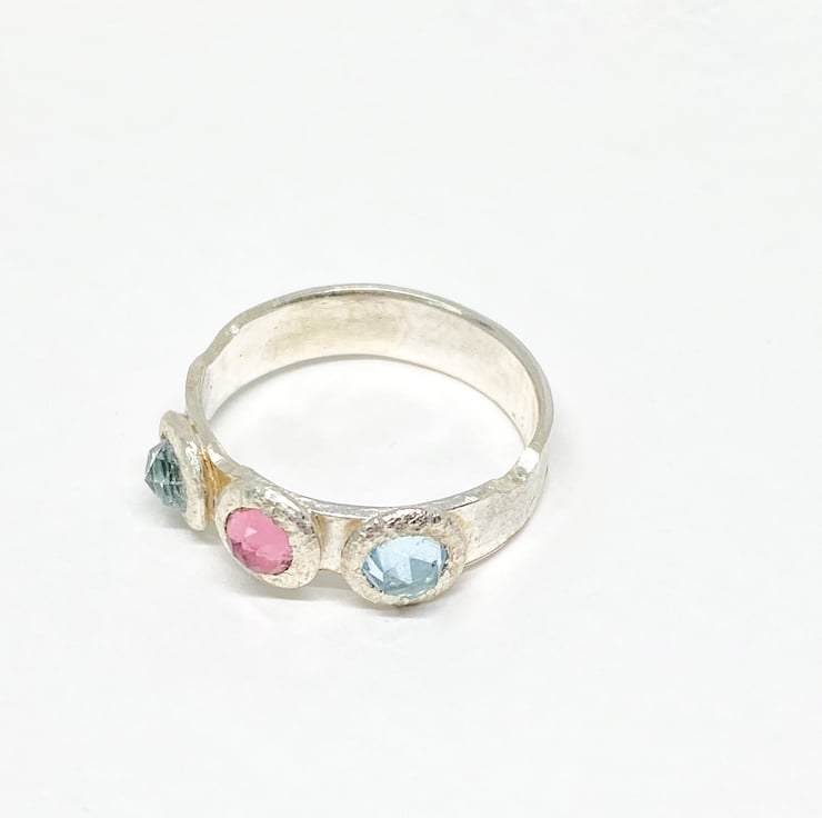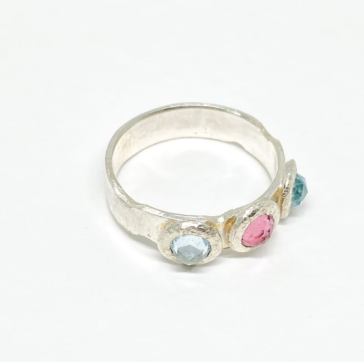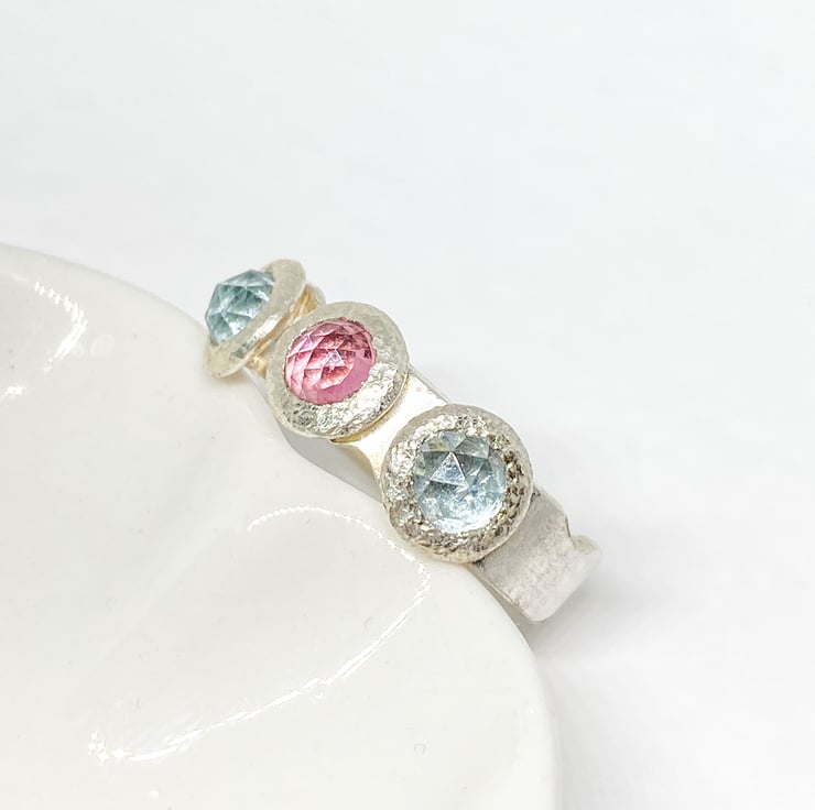 Three rose cut gemstones have been set into sterling silver, and placed on a silver band that has waves cut out in the side. Two blue topaz at each side of a pink tourmaline.