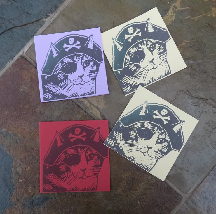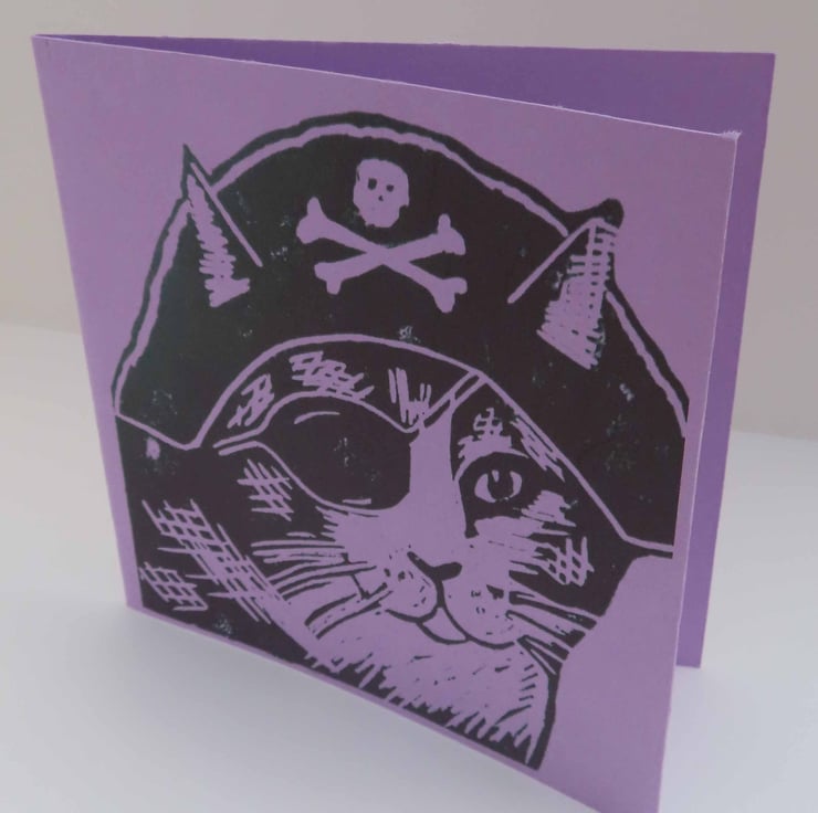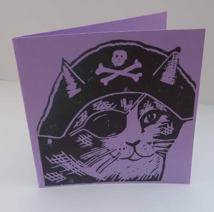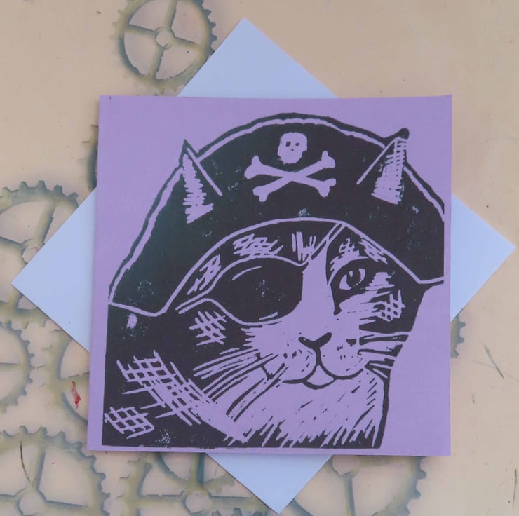 Blank greeting card reproduced from my original lino cut print Pirate Kitty