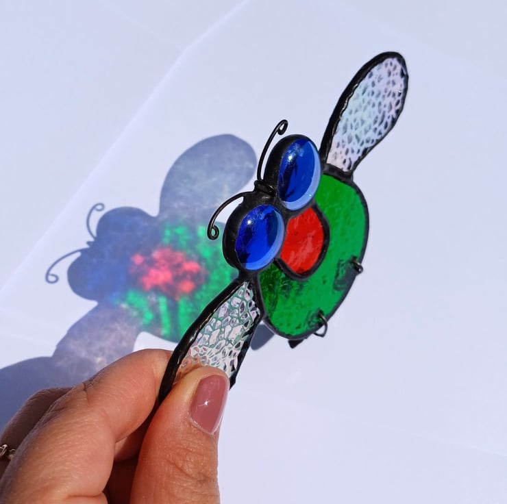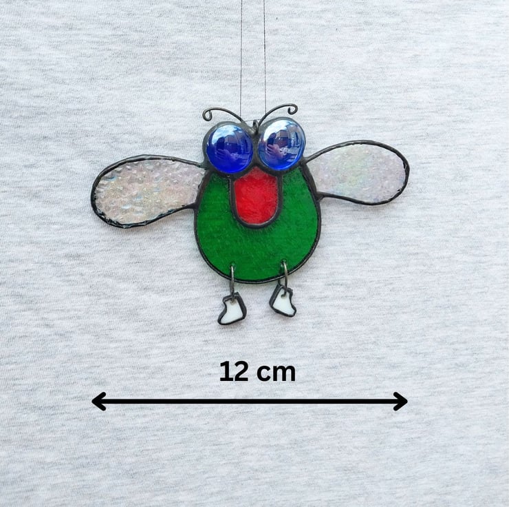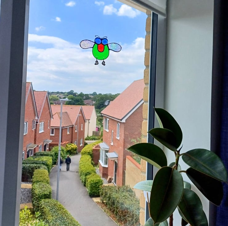 A large (12 by 9 centimetres) bright glass Fly on your window will protect your home from real small flies and mosquitoes.