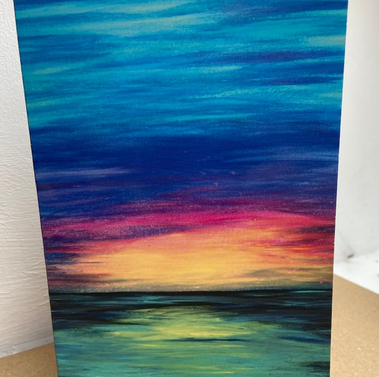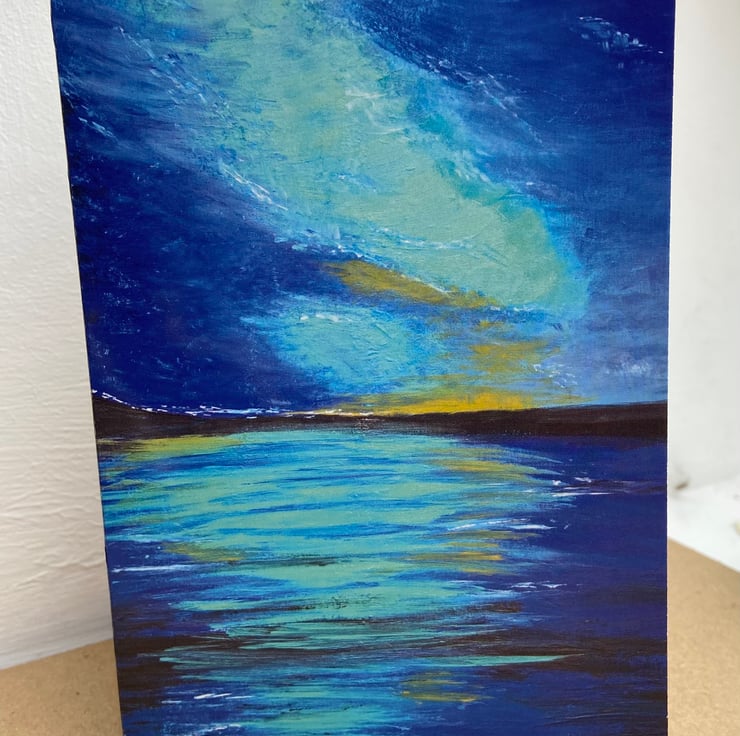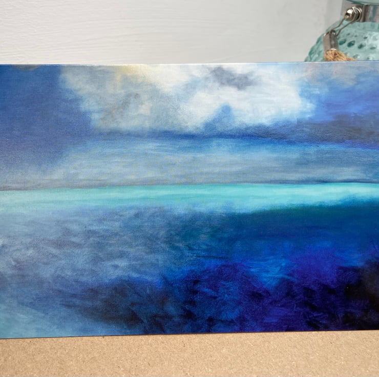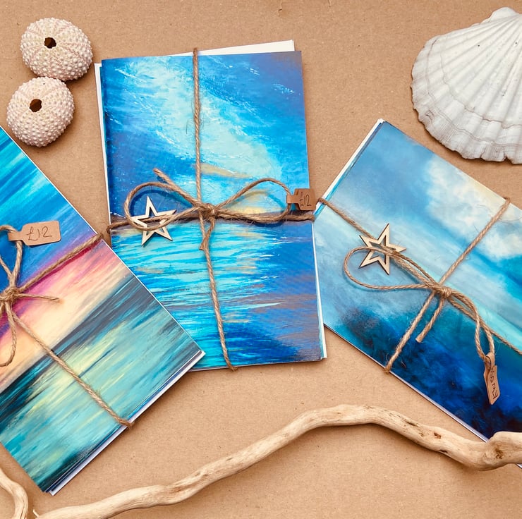 Each card in this delightful bundle showcases a unique abstract seascape original art print, capturing the serene beauty of the ocean in different artistic mediums. Two of the cards feature vertical designs, showcasing mesmerising acrylic paintings with vibrant colours. The third card, in a horizontal format, displays a print taken from an enchanting oil painting, adding a touch of depth and richness to the collection.