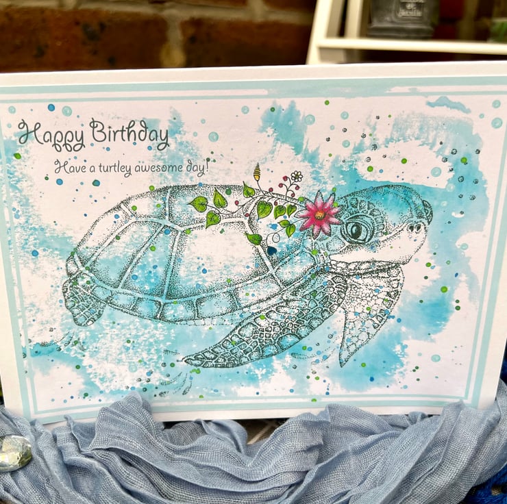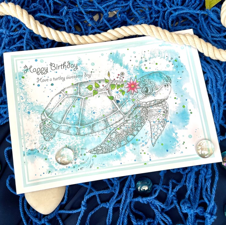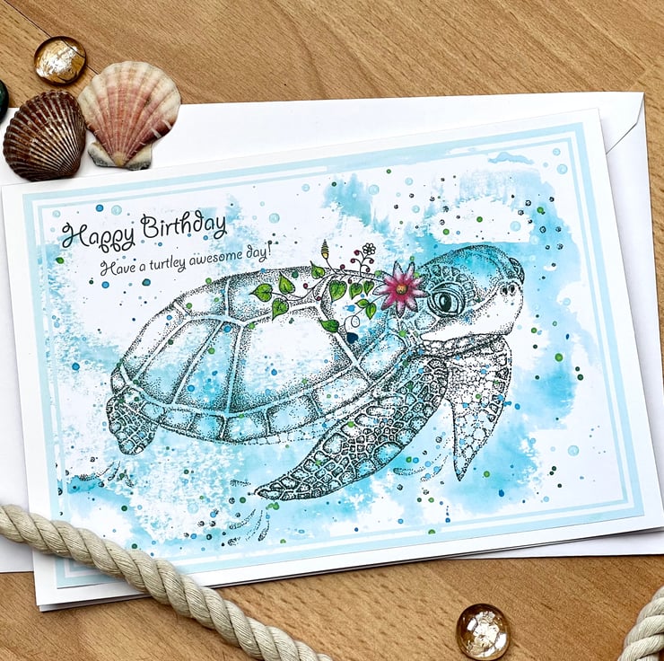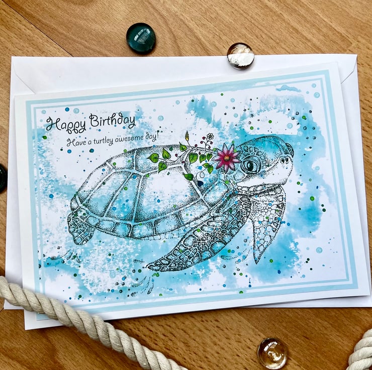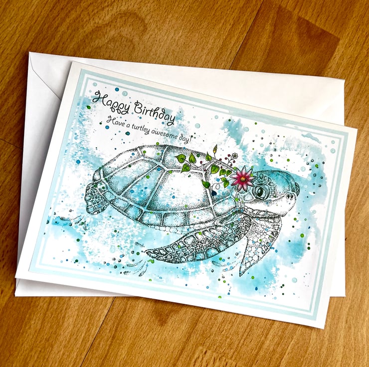 This design makes a lovely greeting card & can be kept as a print decoration around the home afterwards for any turtle fan.