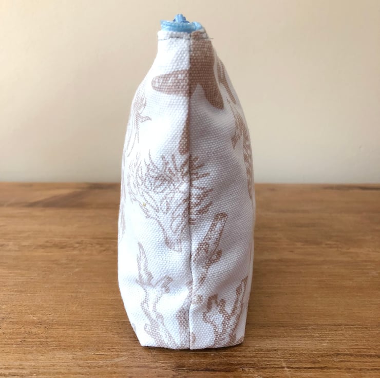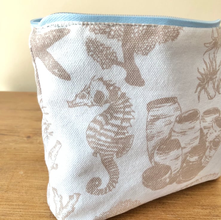 A seaside theme pouch bag is great for keeping cosmetics in and other bits and pieces. The pouch bag is made from reclaimed/up-cycled fabric - the outer is made from a tea towel!