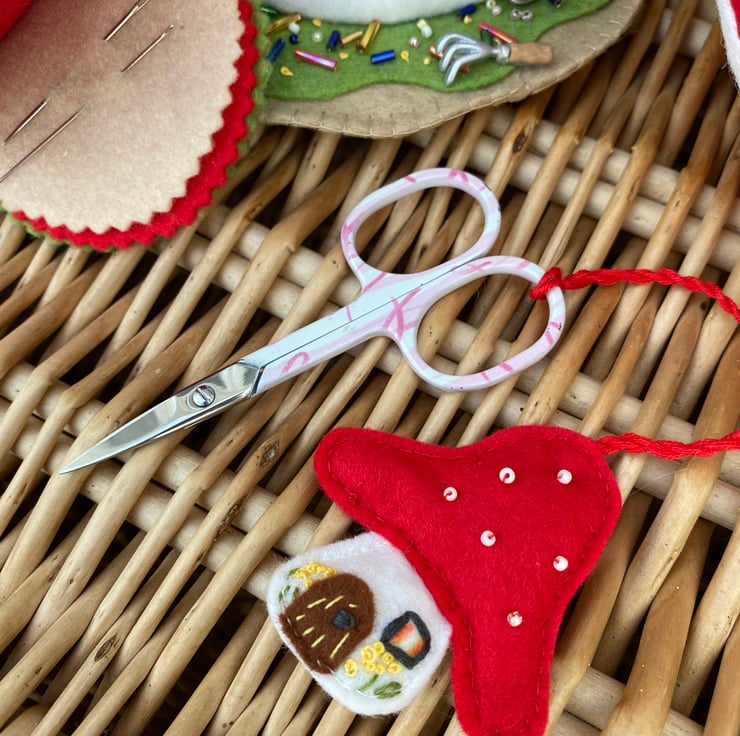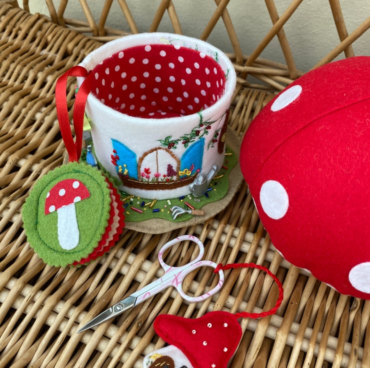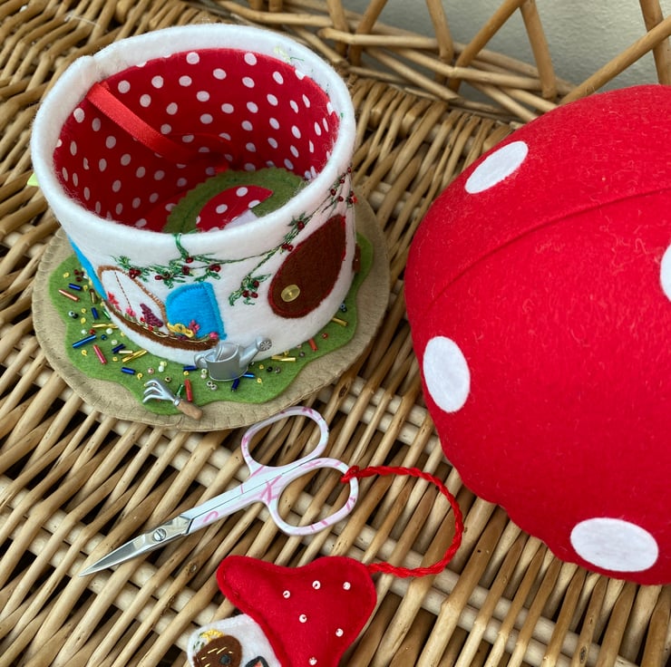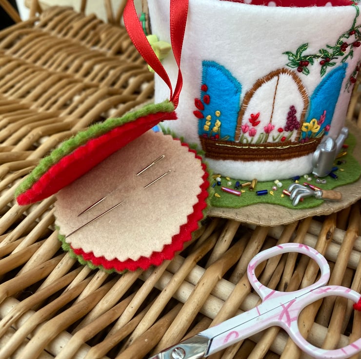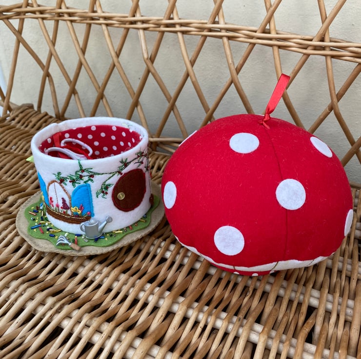 This is a large Pincushion with space for sewing items in the base when the Toadstool top is lifted off by the ribbon loop. There are two essential items that all sewers need to always be at hand, a needle book and a scissor keeper and these are included with this gift. To make it even better I have attached a pair of small scissors so that this fun and useful gift is ready for action.