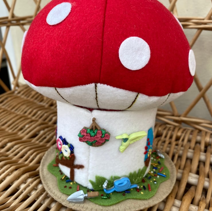 I made this toadstool ‘house’ from a pattern by Daisychain designs in felt and stiffener and plenty of polyester filling for the roof. The door, windows, flowers and climbing rose were added with hand and machine embroidery and special buttons were added to the garden for fun, with a sprinkling of beads for luck. The size is 7” high by 6” at its widest point.