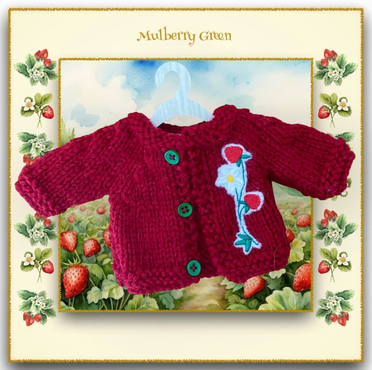 A lovely little red cardigan, embroidered with strawberries and finished off with little buttons, to fit the Mulberry Green characters.