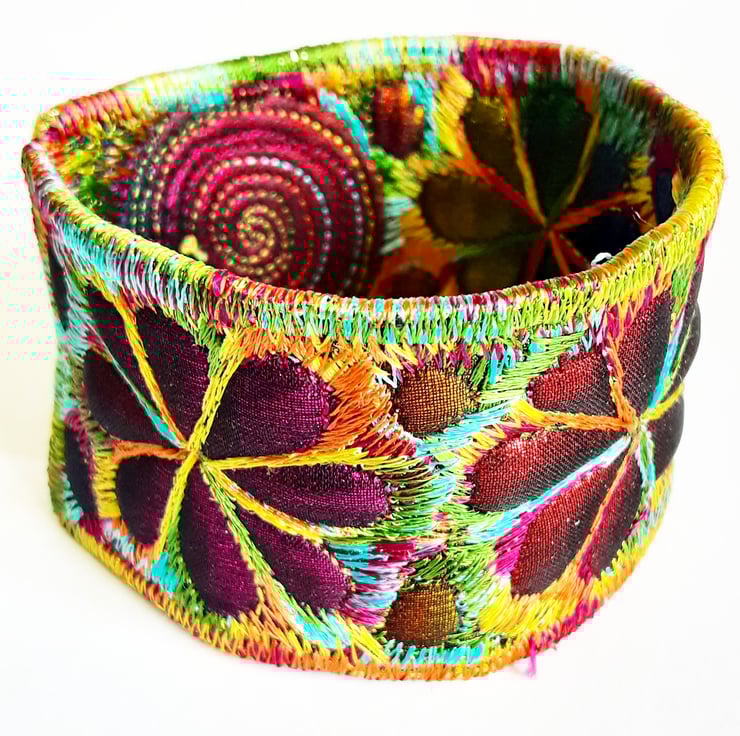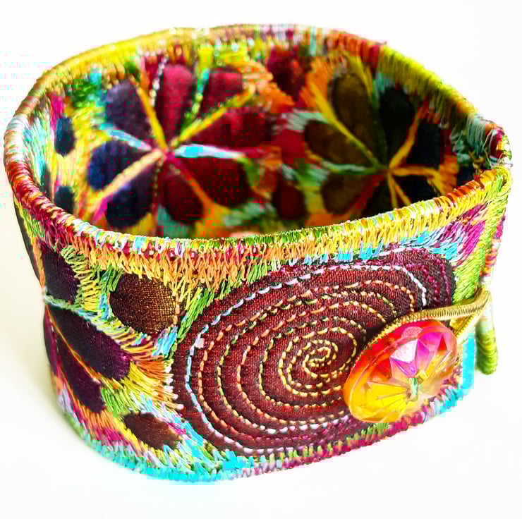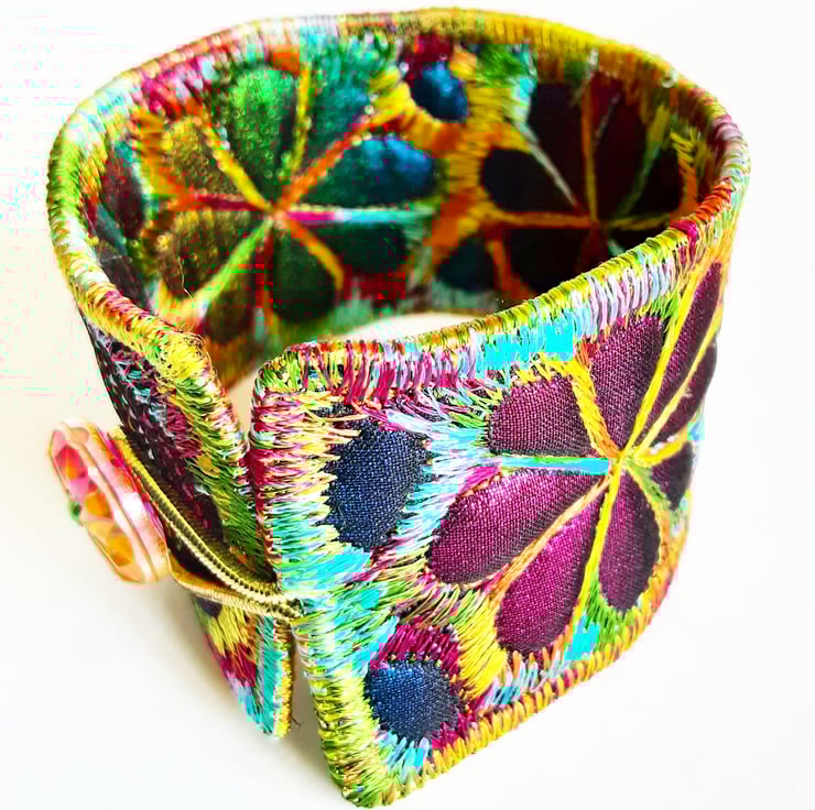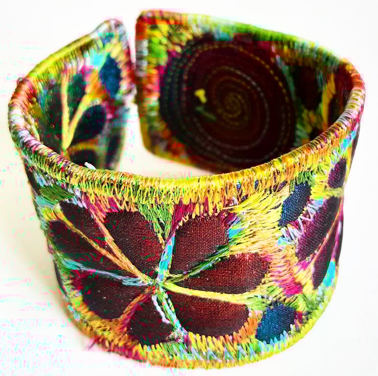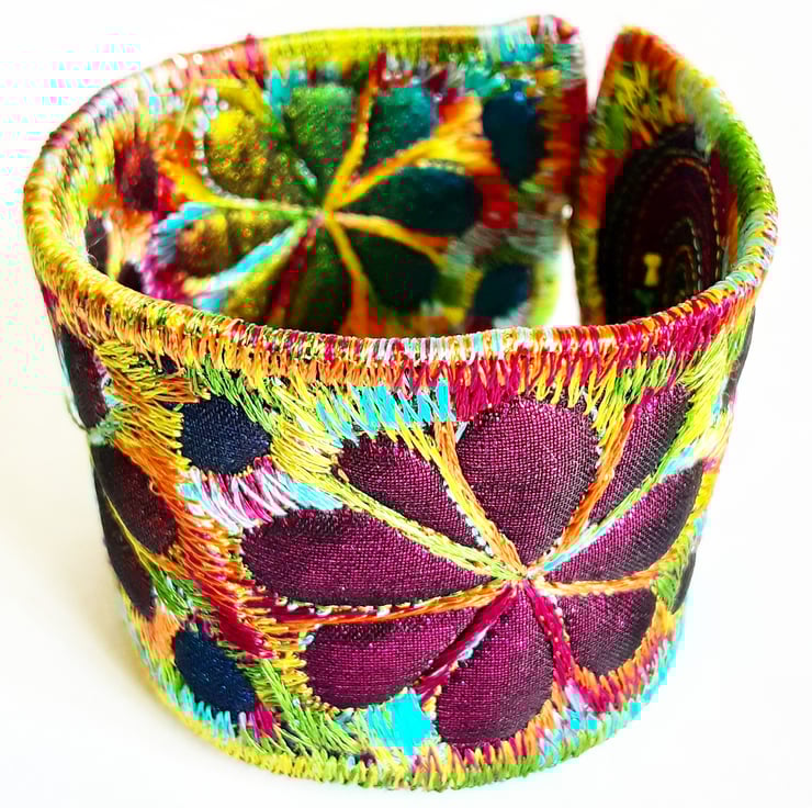This is a handmade machine stitched fabric Stiched Silk Cuff or bracelet.which changes color as itmoves round.