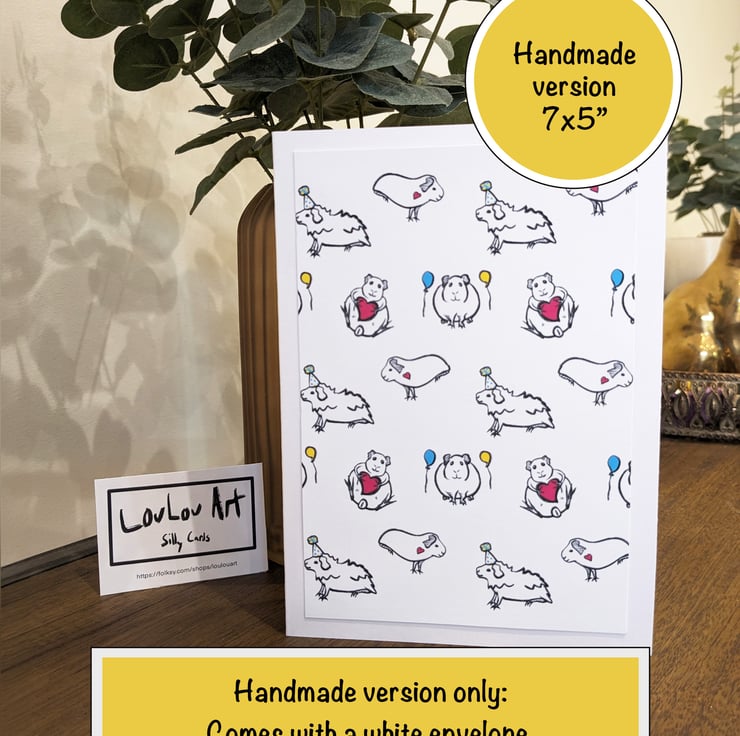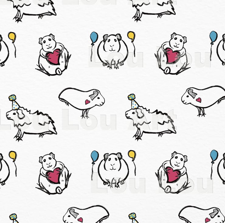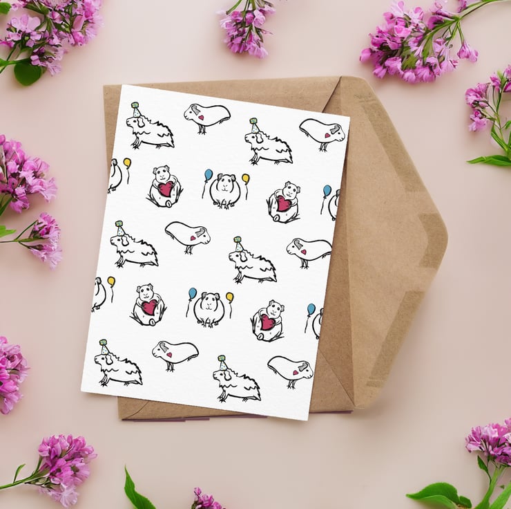 A card covered in guinea pigs! A lovely group of guinea pigs celebrating, partying and expressing their love. This would be great for a birthday, a congratulations or even just to cheer someone up.