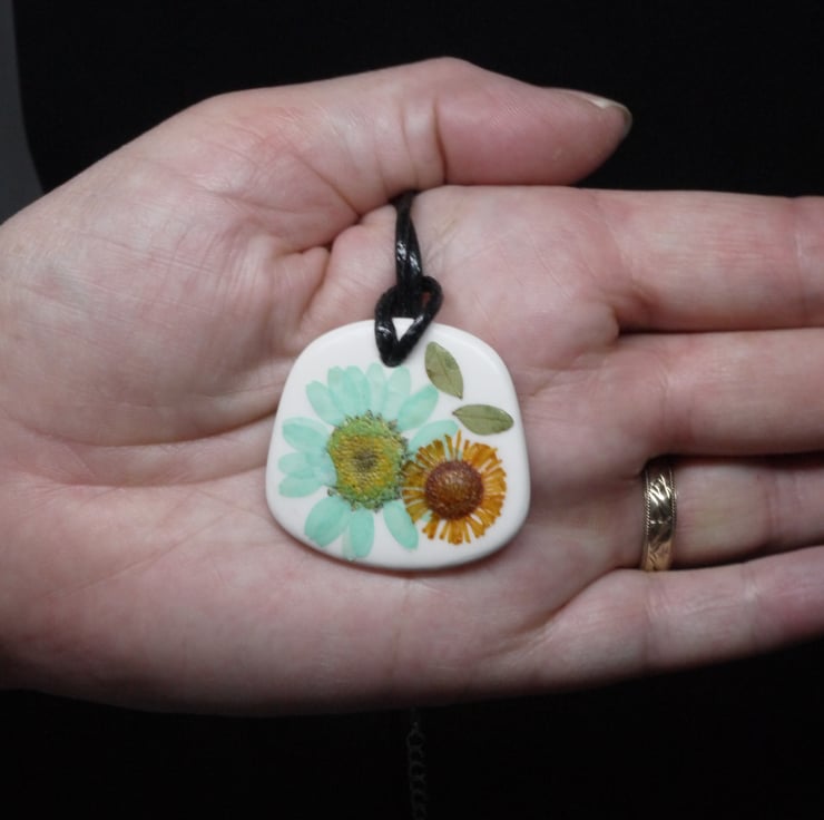 A 5.5 x 5.5 inch greetings card featuring real pressed flowers and leaves with a stamped sentiment along with matching ceramic pendant with black cord. All our cards come with a matching envelope and packed in a cellophane bag. The pendant will come in a pillow box wrapped in tissue paper.
