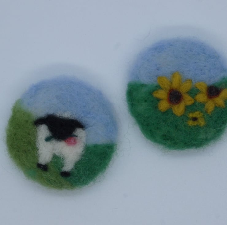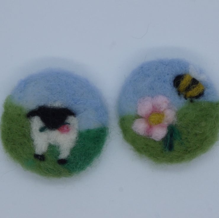 Handmade needle felted magnets featuring a mix of sheep, flowers and bees. Pack of 2.