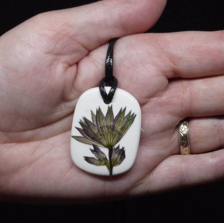 Handmade pressed flower card featuring real flowers and a stamped sentiment with matching ceramic pendant. All cards come with matching envelope and packed in a cellophane bag. Te pendant will come in a tissue box, wrapped in tissue paper.