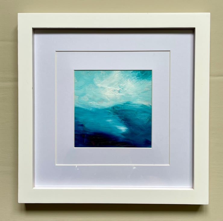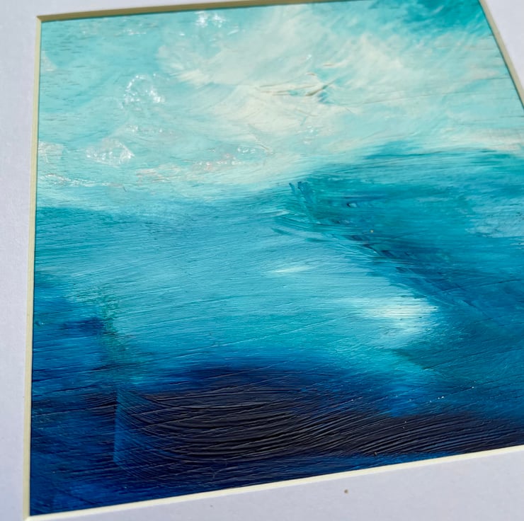 Original art painted on 10cm or 4 inches square (approximately) primed wood board with abstract/impressionistic blue seascape painted in artist grade acrylic paint, in a mixture of blues, with a hint of white and a splash of silver, I’ve tried to show a good representation of the colours but colours may vary depending upon the screen you are using.