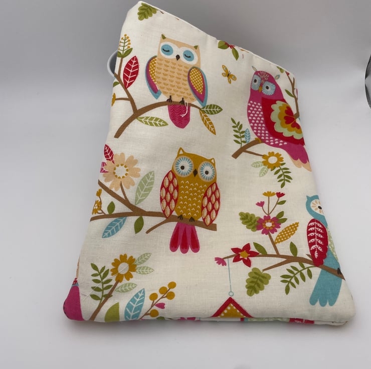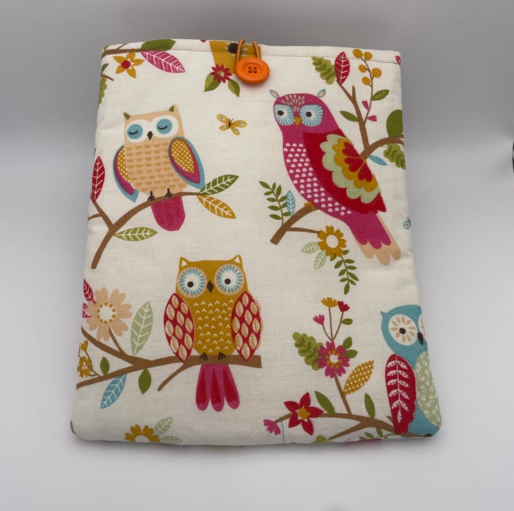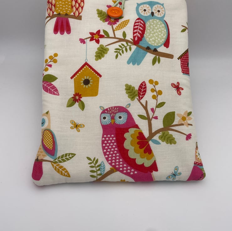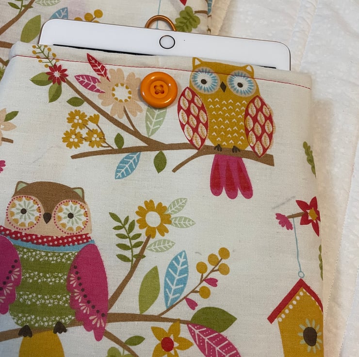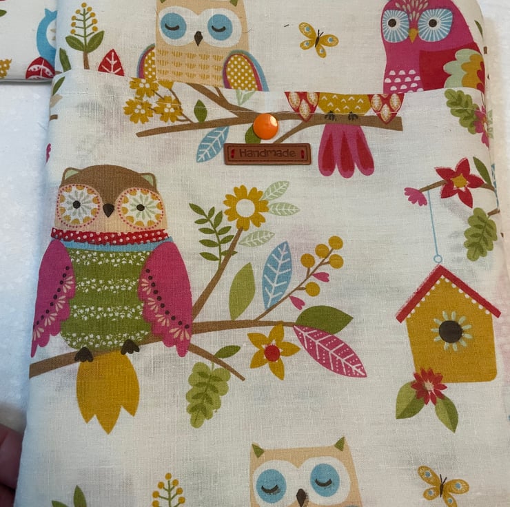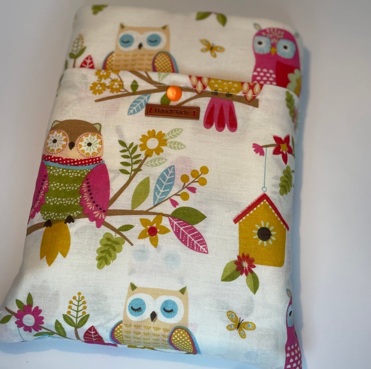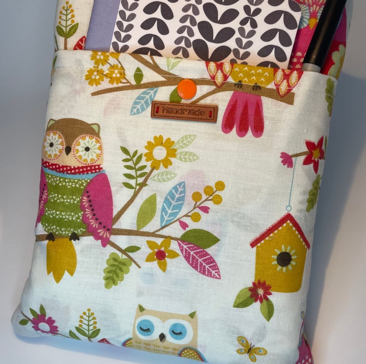 This lovely book sleeve is hand made with predominantly recycled materials. Some parts have newly sourced materials (e.g., buttons, thread and hair ties etc). It is 8 x 10 inches (approx) This has a pocket on one side for additional items such as pens, notebooks or snacks.