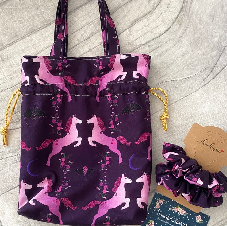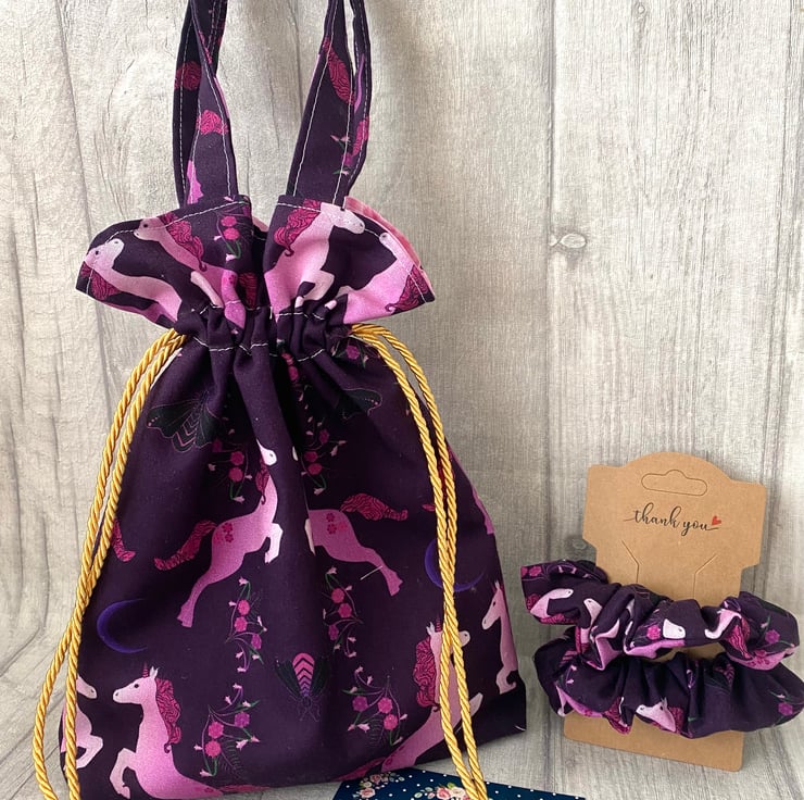 Beautiful girls dolly style bag with two matching scrunchies. The bag measures approximately 10 x 8” (excluding the handles), it’s fully lined and finished with a gold coloured tie cord which works sets off the print on the fabric. This would make a beautiful gift for a young lady. I have lots of other beautiful fabrics available on request.