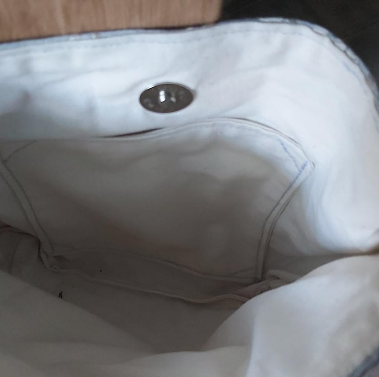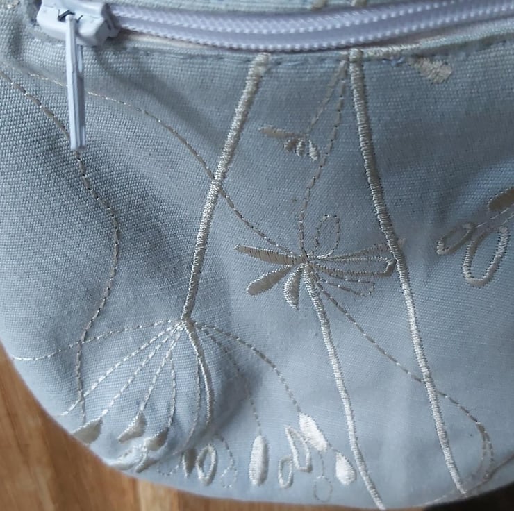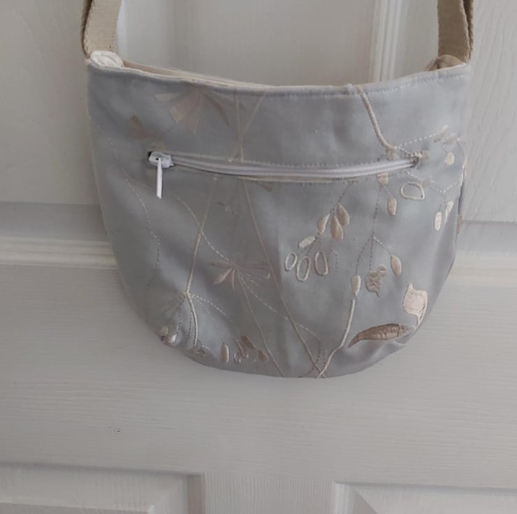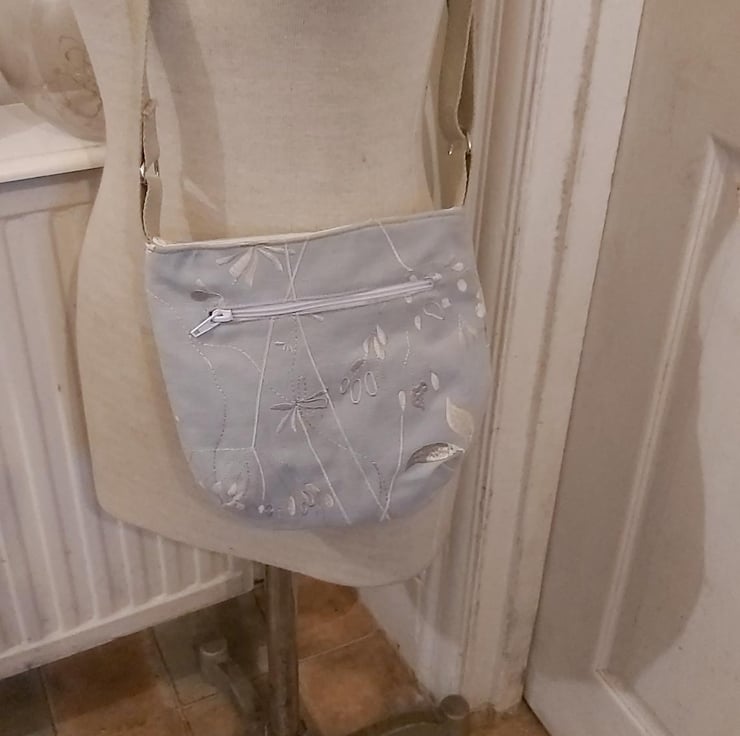 Silver floral small trail tote. as with all my bags made with rescued upholstery/furnishing fabric making it strong, durable and unique. this bag has a handy front zip pocket amd a small inner plain pocket. with cream linning. The webbing strap is adjustable to wear crossbody or on the shoulder. the silver bag has a floral design of leaves, buds and delicate flowers embroidered in silver.