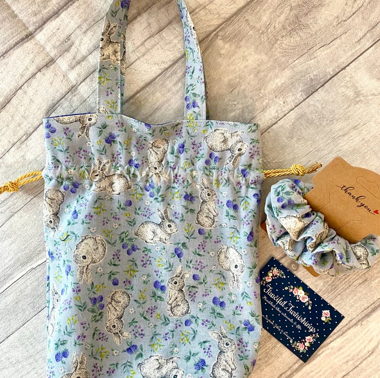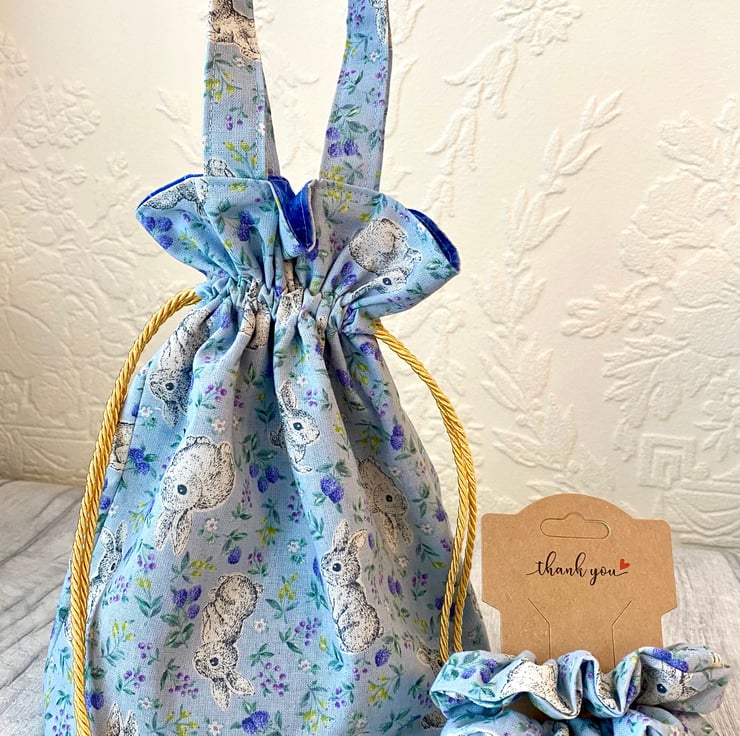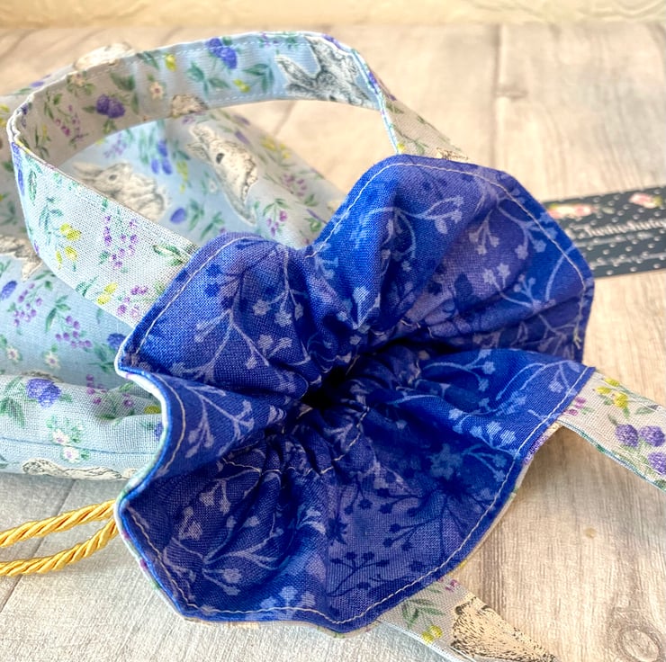 Beautiful girls dolly style bag with two matching scrunchies. The bag measures approximately 10 x 8” (excluding the handles), it’s fully lined and finished with a gold coloured tie cord which works sets off the print on the fabric. This would make a beautiful gift for a young lady. I have lots of other beautiful fabrics available on request.