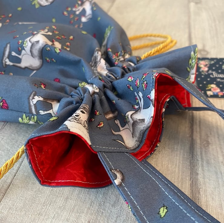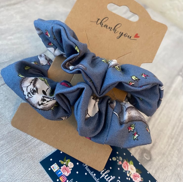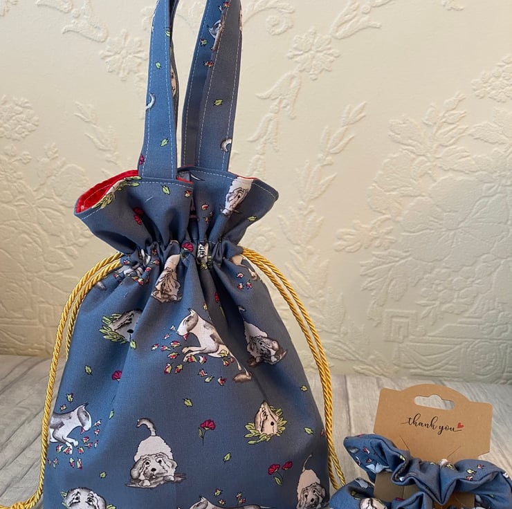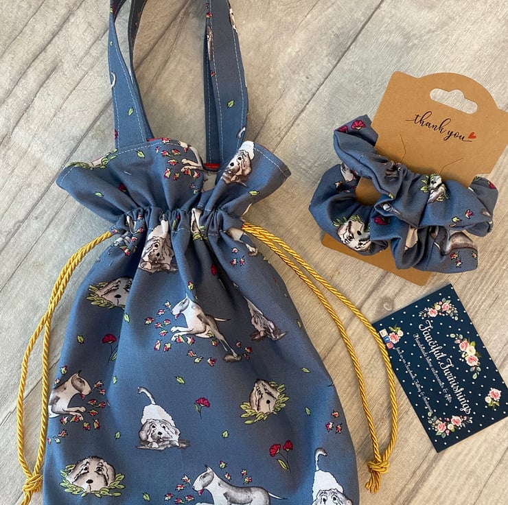 Beautiful girls dolly style bag with two matching scrunchies. The bag measures approximately 10 x 8” (excluding the handles), it’s fully lined and finished with a gold coloured tie cord which works sets off the print on the fabric. This would make a beautiful gift for a young lady. I have lots of other beautiful fabrics available on request.