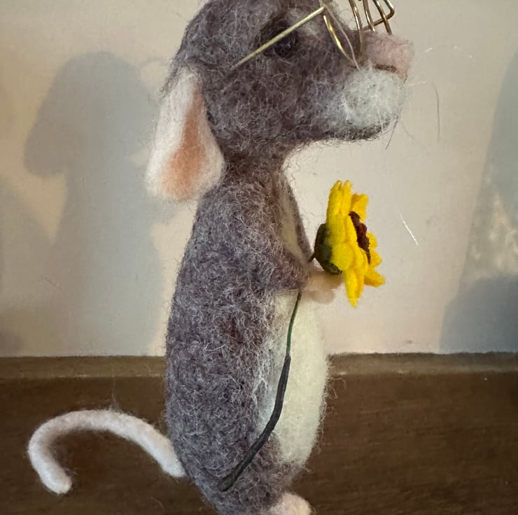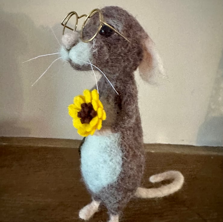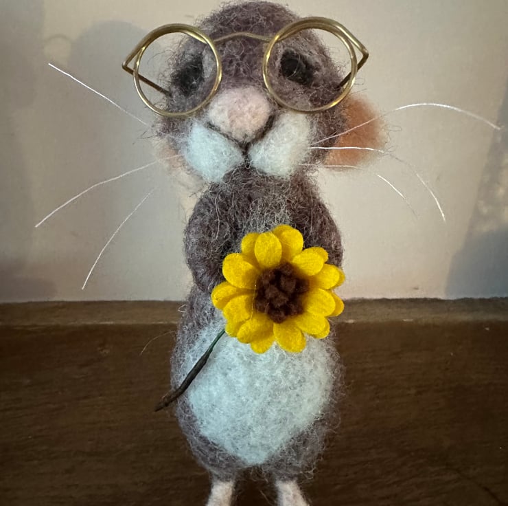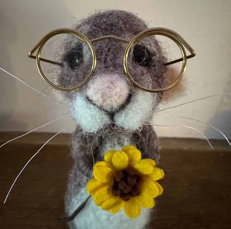 Needle felted in wool on a wire armature, bead eyes, cotton whiskers, wire glasses and felt flower