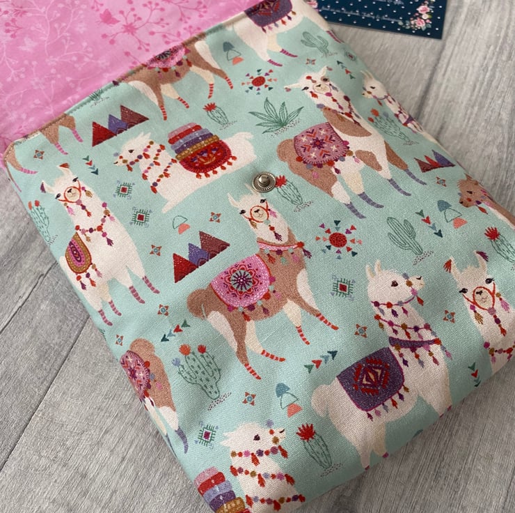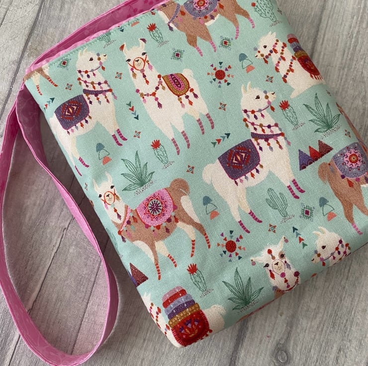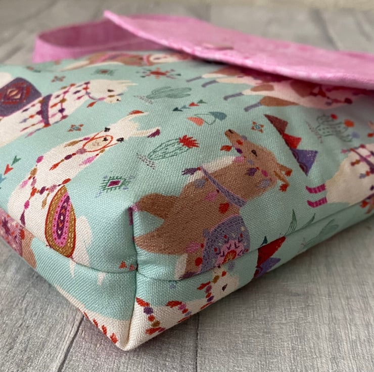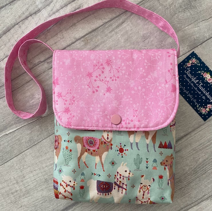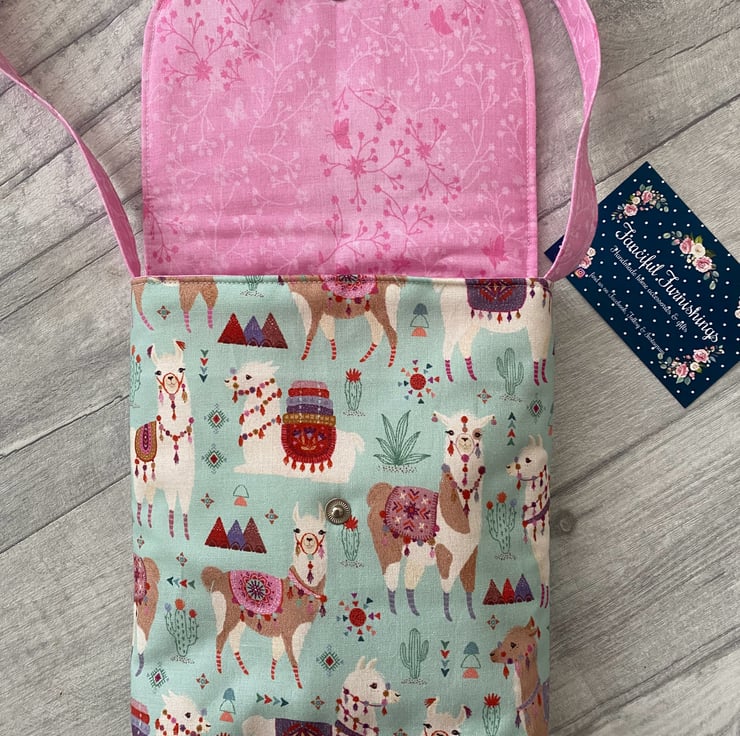 Pretty Llama themed 100% cotton fabric matched with a mint green background with a pretty pink fabric for the lining & flap. This cute little messenger bag measures approx 7x8”. I’ve boxed the bottom to give a bit more room to carry those important little toys around. I CAN PERSONALISE THIS BAG - PLEASE MESSAGE ME ONCE PURCHASED