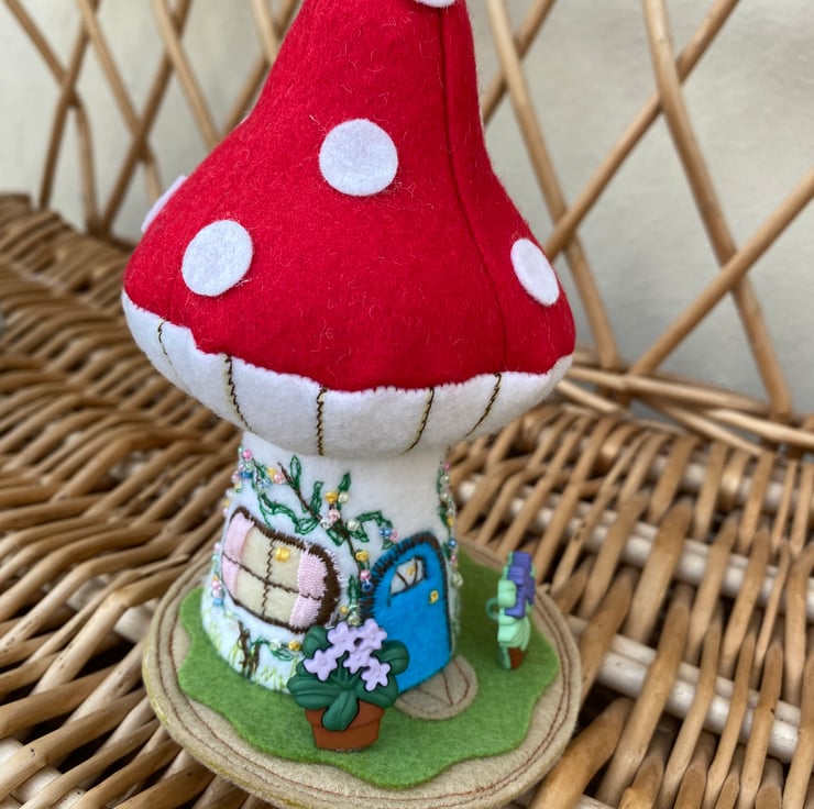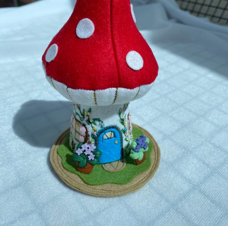 This 5” tall toadstool house can be an ornament, a pincushion or an ornamental pincushion.