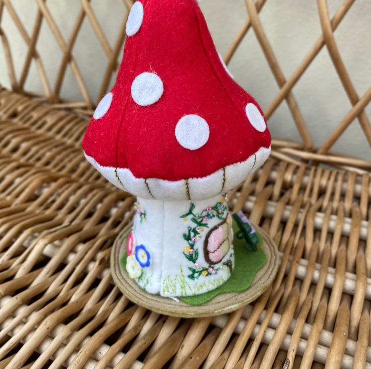 Novelty Pin Cushion. Toadstool House with Buttons and Beads for Needleworker.