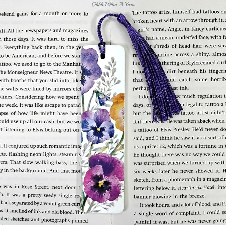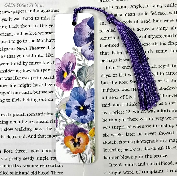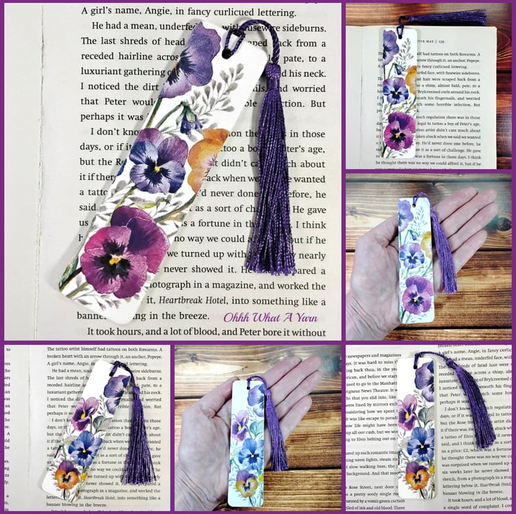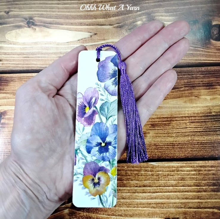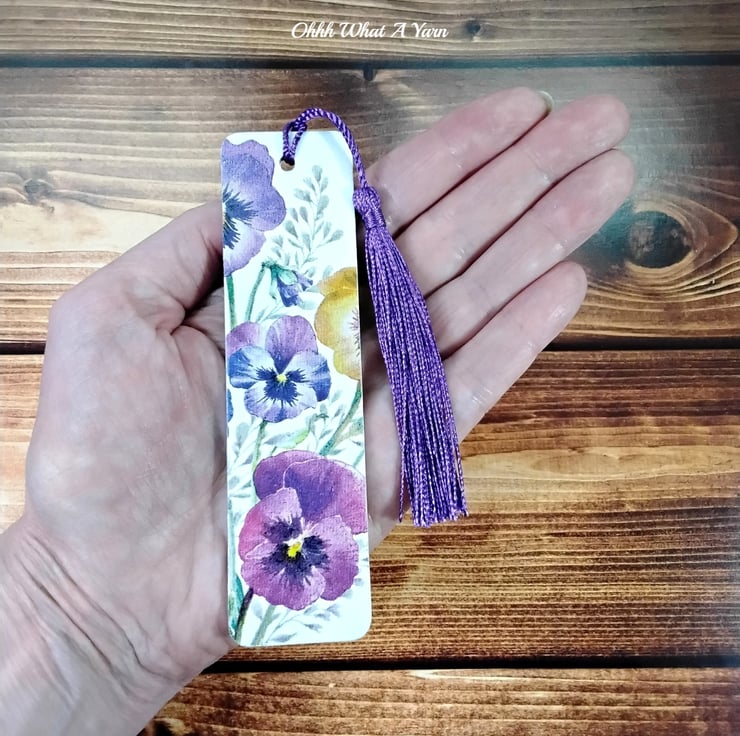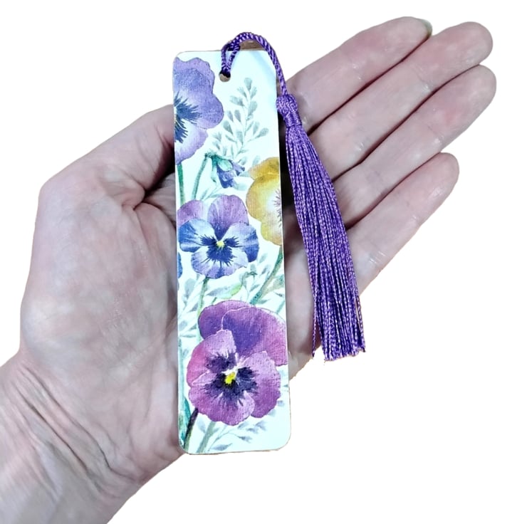 This pretty pansy bookmark has been created using copyright free paper napkins on a wooden bookmark. It measures approximately 12cm by 3 cm. It is decorated on both sides with different pansy designs.