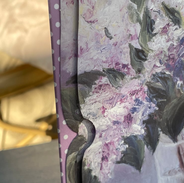 A card for a sad occasion. This approximately A5 shaped card is for those sad occasion we find so difficult. The card features an oil painting style image of a vase of hydrangeas, a soft image in keeping with a sympathy card. The greeting on the front says Thinking of you. Inside the card has the verse May cherished memories bring you comfort and peace.