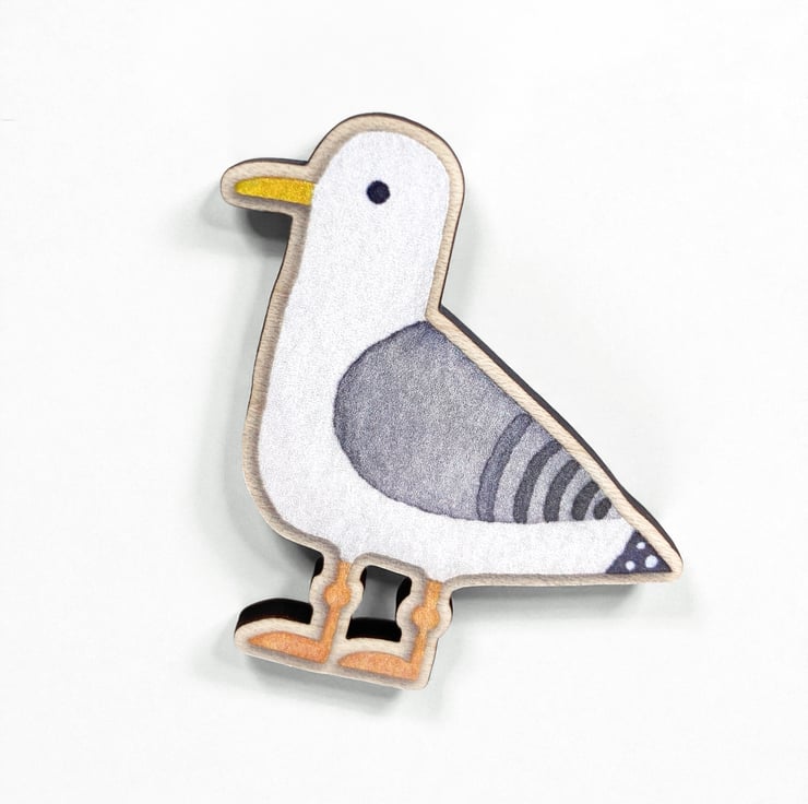 The seagull measures 5cm x 4.5cm. The chunky wood elements are 4mm thick and the magnet on the back has a depth of 5mm.