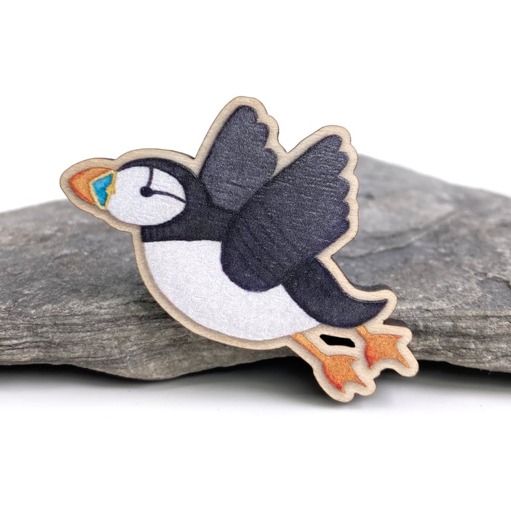 The puffin measures 5.5cm x 3cm. The chunky wood elements are 4mm thick and the magnet on the back has a depth of 5mm.