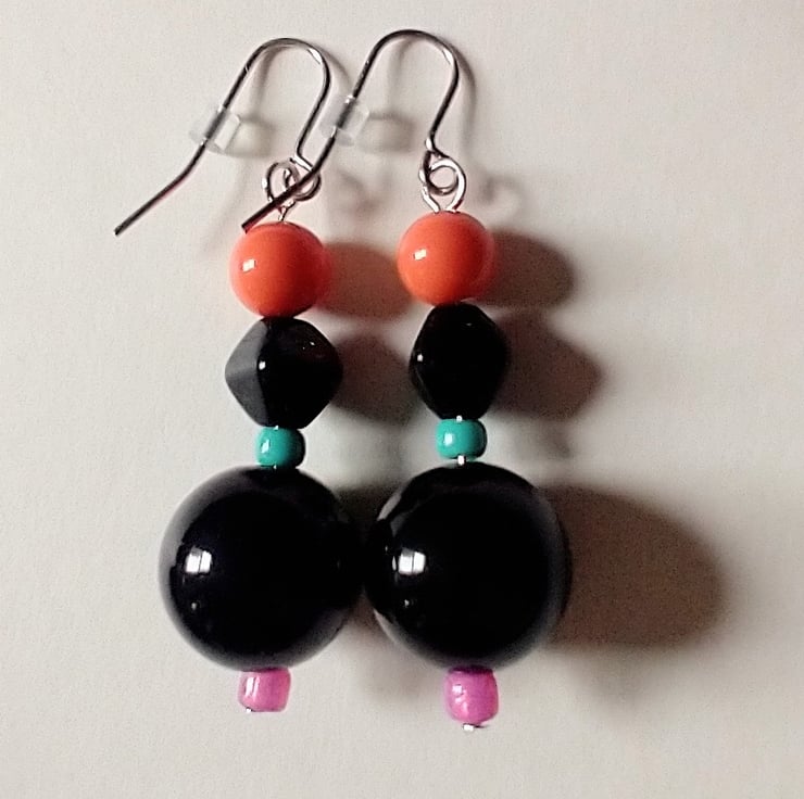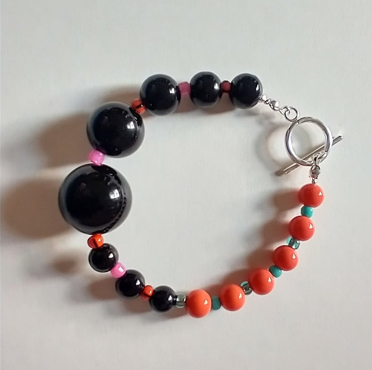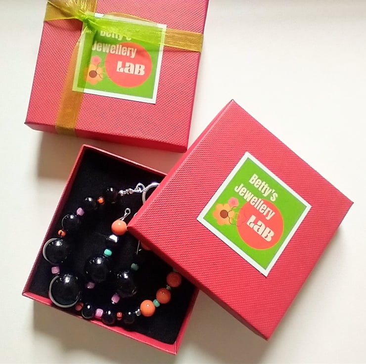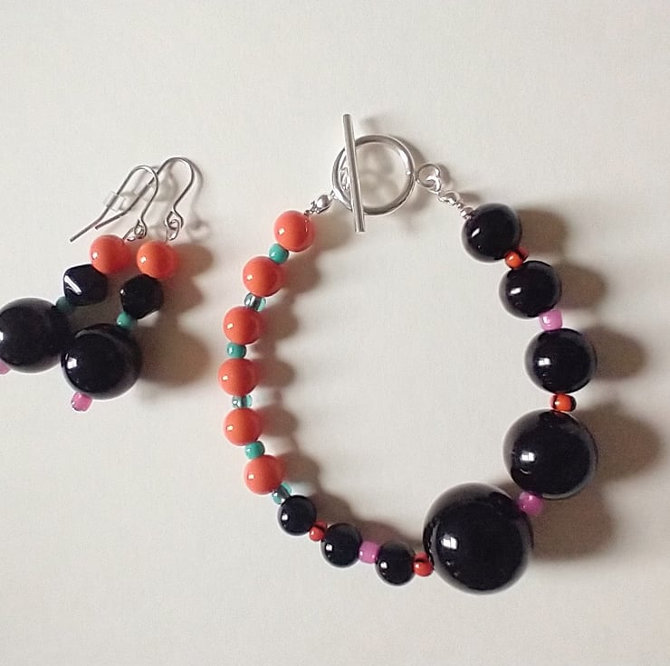 Bold statement bracelet and earrings set. Featuring upcycled, graduated black beads, orange beads and glass seed beads to complement in hot pink, orange and turquoise. So stylish abd chic! The black beads are upcycled plastic and the jewellery is very light to wear.