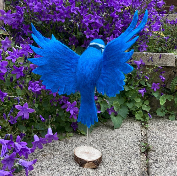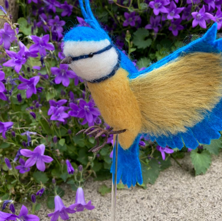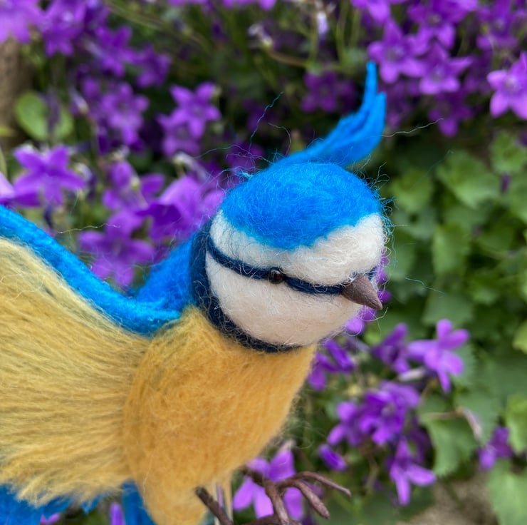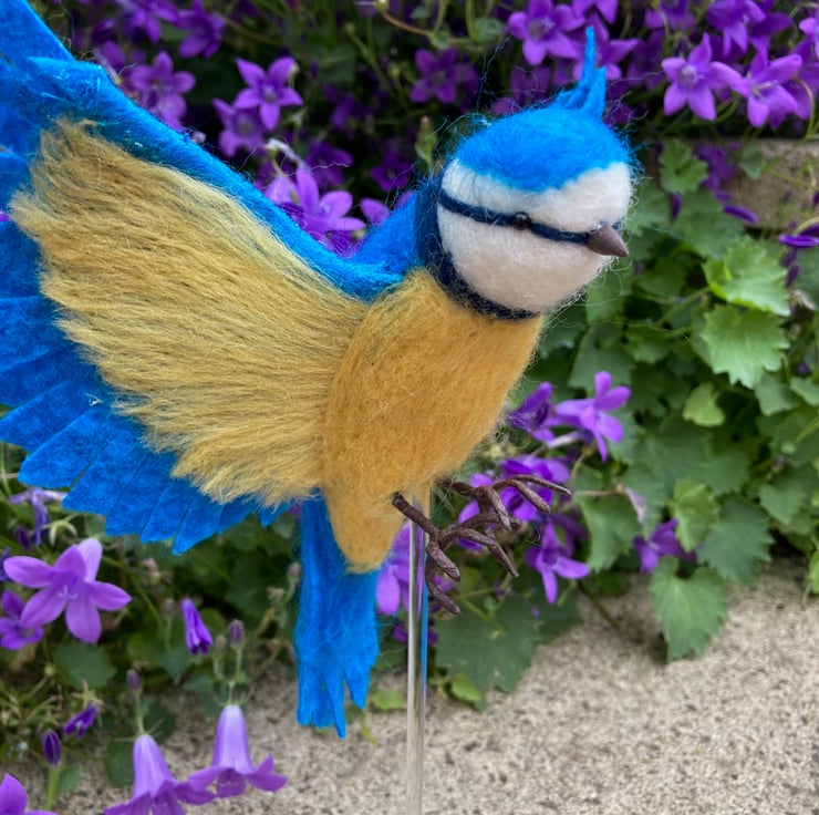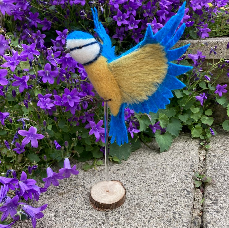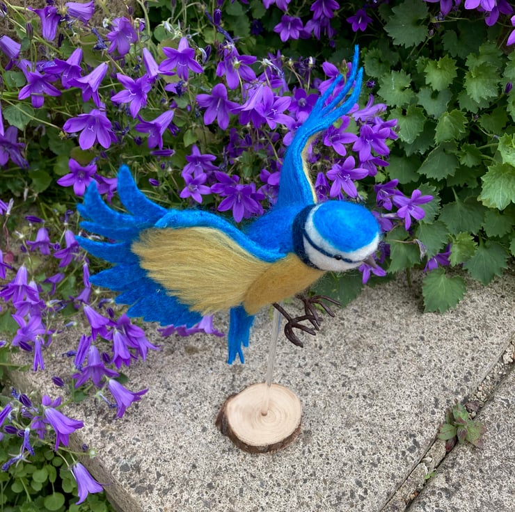 This needle felted blue tit sculpture has been been needle felted, a technique where woollen fibres are bound together and sculpted into shape using a barbed felting needle. The blue tit has been posed in flight with outstretched wings. After sculpting the basic shape using white core wool, a top coat of merino wool fibres in appropriate colours have been added. The tail and wings of the blue tit have been formed from pieces of stiffened wet felt. The leading edge of the wings have been wired to enable them to be shaped as required. The legs are formed from tape wrapped wire and the eyes are beaded. Finally silk clay has been used to create the beak.