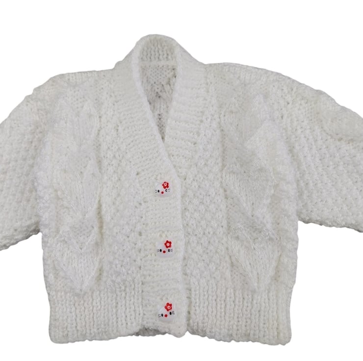 Keep your little one snug and stylish with this adorable hand-knitted baby cardigan! Designed with love, this sweet piece features a textured heart pattern across the front, back, and sleeves. The cosy V-neckline makes it perfect for layering, and the cutest white cat face buttons (with a red flower detail!) add a playful finishing touch.