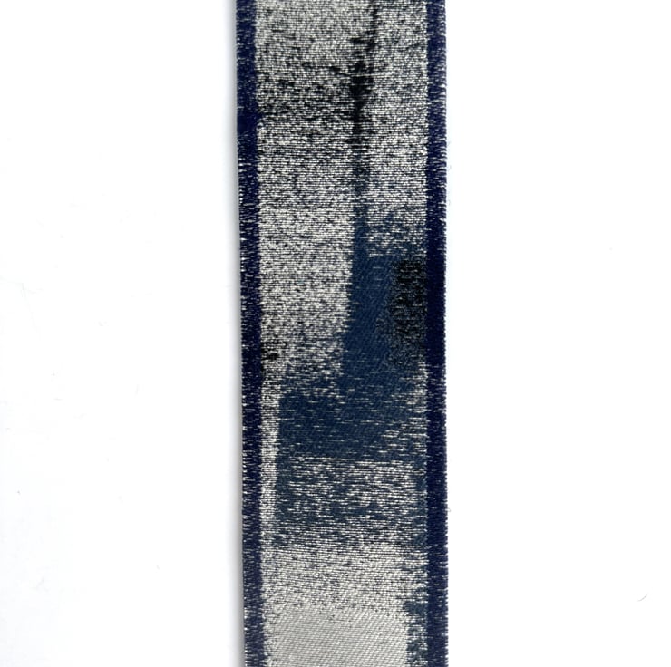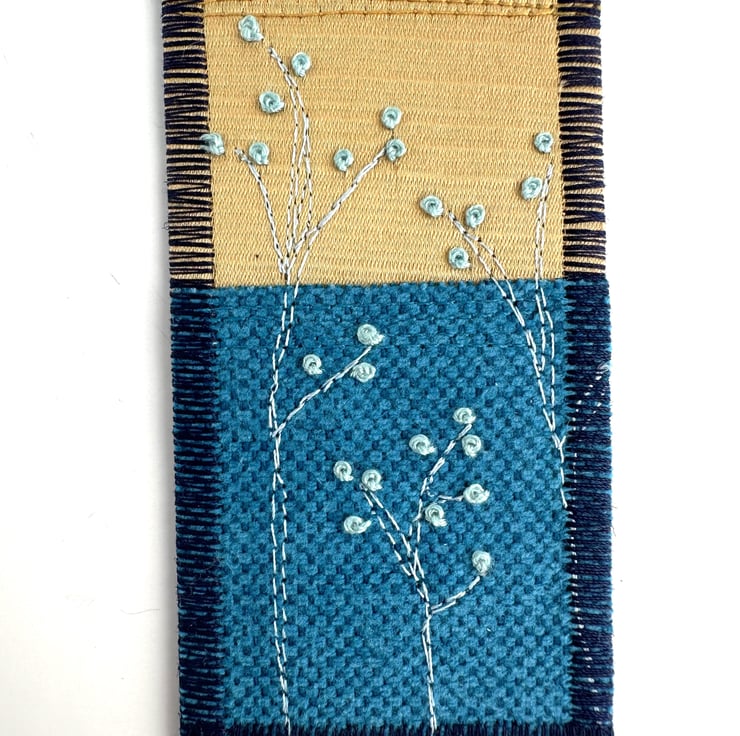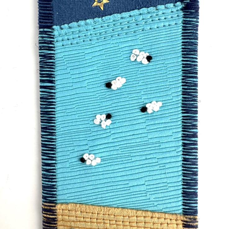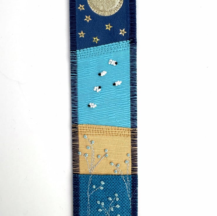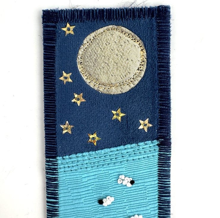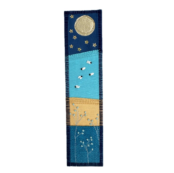 Bookmark with moonlit meadows scene. This textile art bookmark is made from a mixture of different fabrics and has been free-motion and hand embroidered. The design features meadows under a full moon and starry night sky. The sky is made from a dark blue velvety fabric. The meadows are made from layers of different fabrics, which include a bright turquoise fabric with a textured pattern and slight sheen, a gold satin, and a dark turquoise upholstery fabric. To the foreground of the scene, I’ve added free-motion embroidered stems with hand embroidered French knot flowers in duck-egg blue. The moon is made from gold lamé, and is surrounded by gold holographic sequin stars. To one of the fields I've added some tiny hand embroidered sheep. The bookmark is backed with fabric with an abstract pattern of rectangular shapes in shades of blue, grey and silver. It is stiffened with an inner layer of interfacing, and edged with zig-zag stitching in navy blue thread.