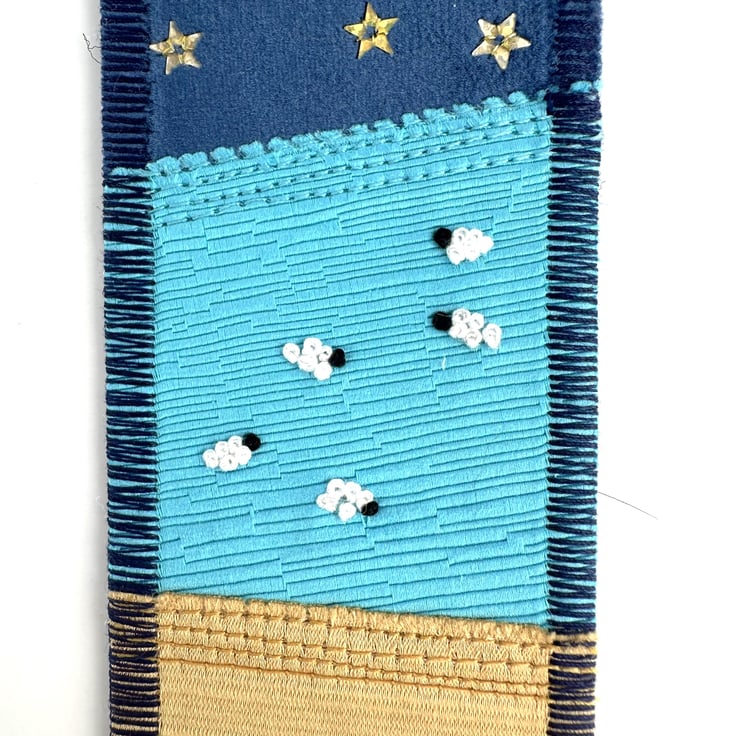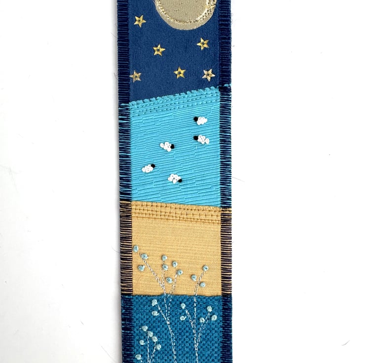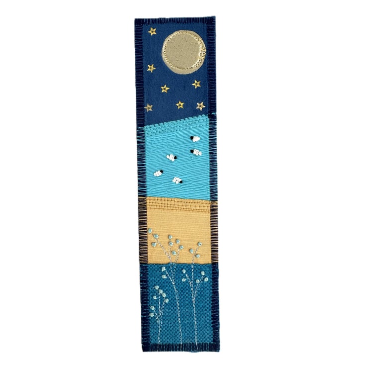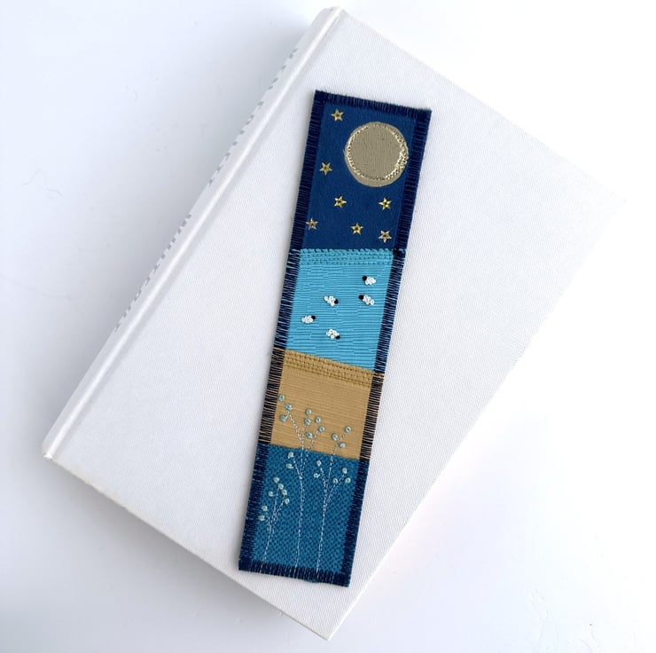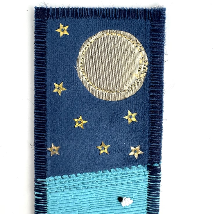 This lovely night-time countryside bookmark would make the perfect gift for anyone who loves reading and the countryside. It is also an inexpensive way of owning or gifting a piece of original textile art.