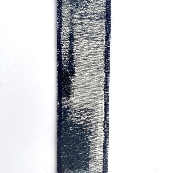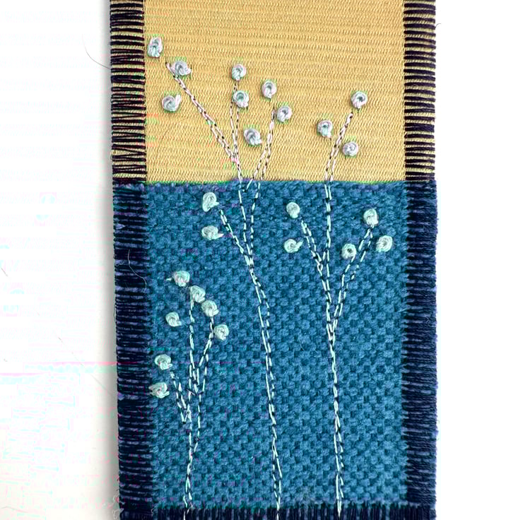 Bookmark with moonlit countryside scene. This textile art bookmark consists of layers of different fabric, appliqué and free-motion and hand embroidery. The design depicts the countryside at night, and features stars and a full moon. The night sky is made from a dark blue velvety fabric. The meadows are made from layers of fabric, including a bright turquoise fabric with a textured pattern and slight sheen, a gold satin, and a dark turquoise upholstery fabric. In the foreground, I’ve added some delicate duck-egg blue flowers with free-motion embroidered stems and hand embroidered French knot flowers. The stars are gold holographic sequins and the moon is made from gold lamé. There is a flock of tiny hand embroidered sheep in one of the fields. The bookmark is backed with fabric with an abstract pattern of rectangular shapes in shades of blue, grey and silver. It has been stiffened with an inner layer of interfacing, and edged with zig-zag stitching in navy blue thread.