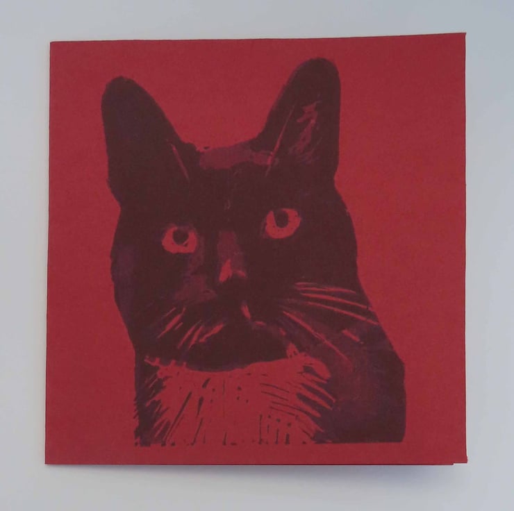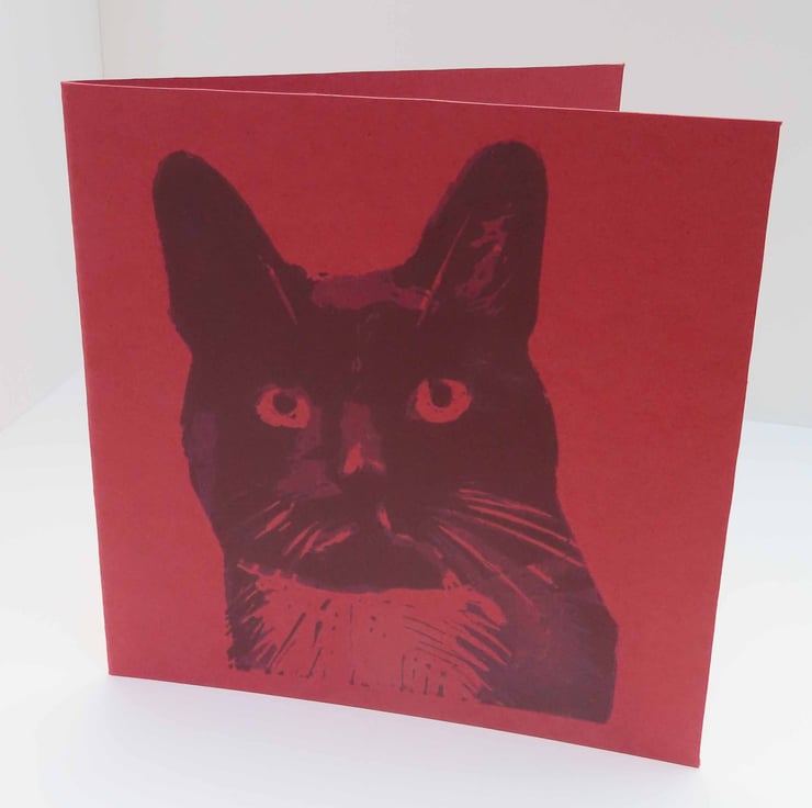 Blank greeting card reproduced from my original lino cut print Black Cat