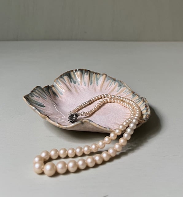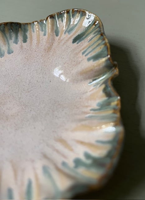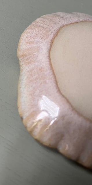 A diminutive trinket dish for tiny treasures, handmade by me. A dark sea green glaze breaking over the edge blends gently into a soft creamy white centre.