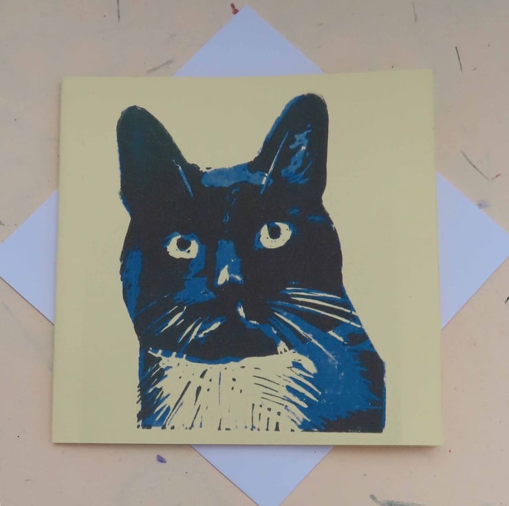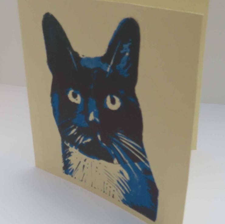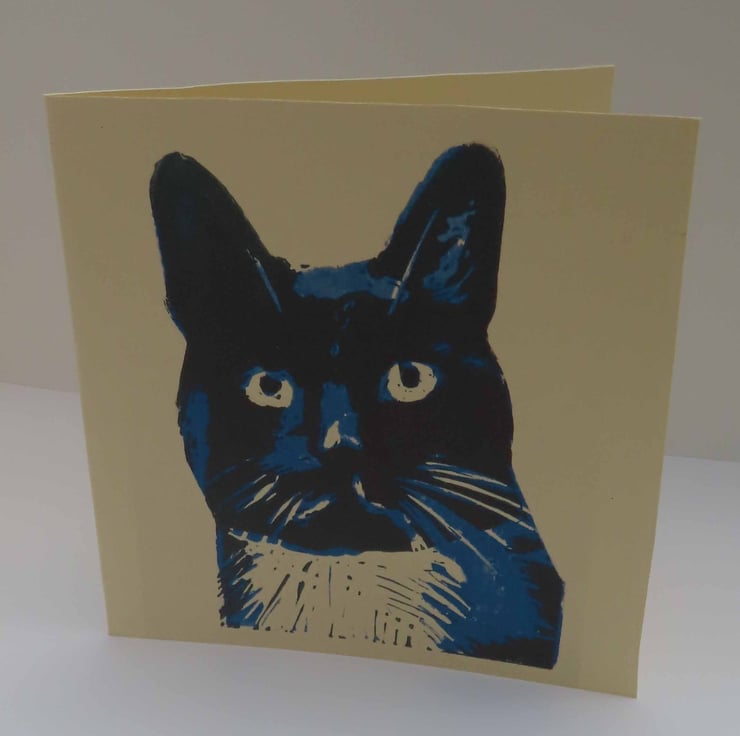 Blank greeting card reproduced from my original lino cut print Black Cat