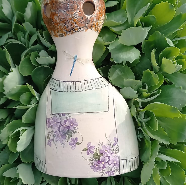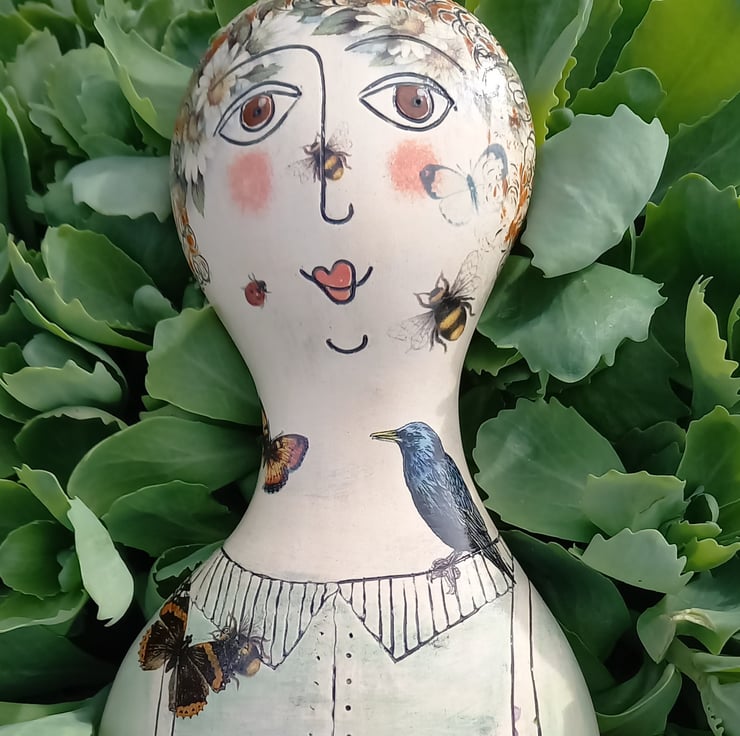 Made in white clay, drawn and painted with coloured slips and glazed in a transparent glaze. Ceramic decals of flowers birds and insects are fired on to add extra detail. Measures approximately 23cms in height. Openings at the back allow for dried flowers and grasses. Will be carefully packed and posted.