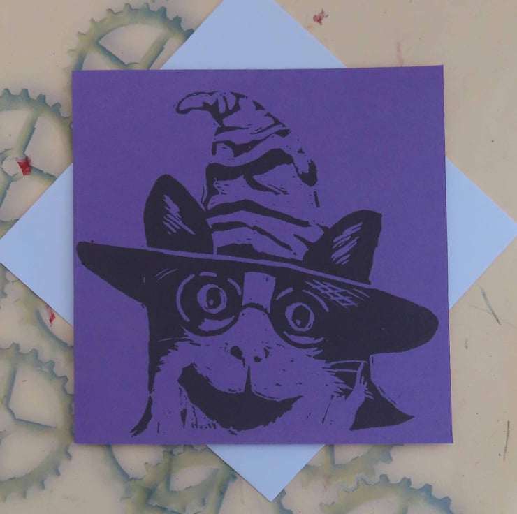 Harry Potter Cat Art Greeting Card From Original Lino Cut Print Purple