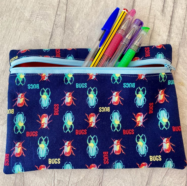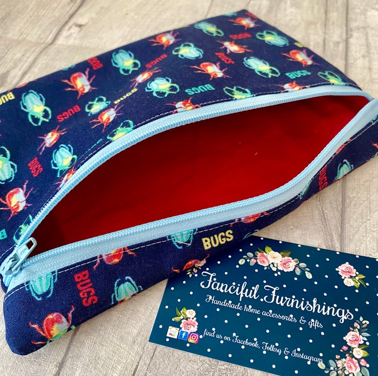 Zip up pouch measuring approximately 8 x 5 1/2”, fully lined in a co-ordinating fabric. These make great pencil cases or storage for small toys etc. I have other designs also available.