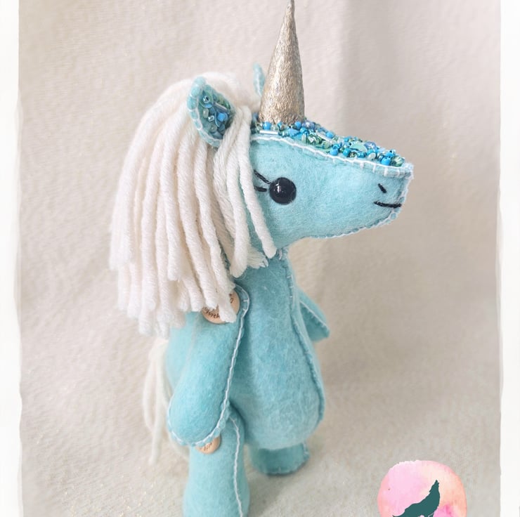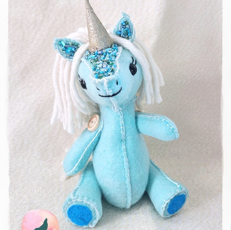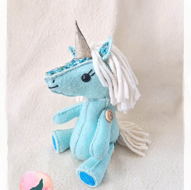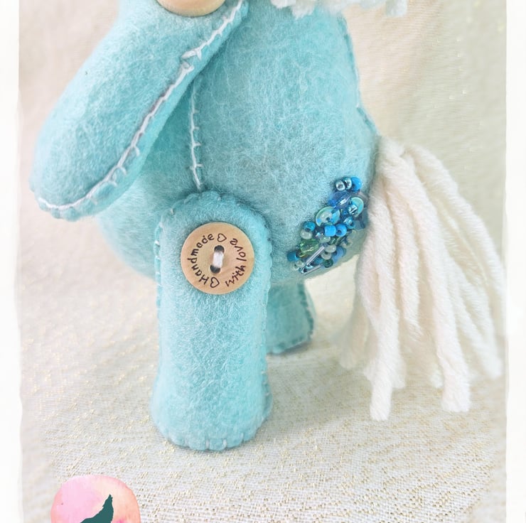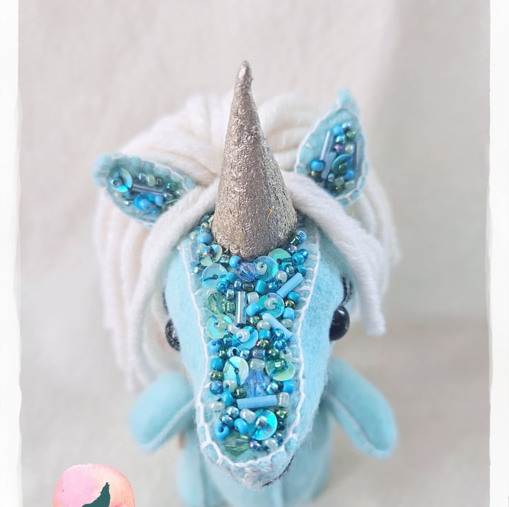 Tiffany is a very magical unicorn in the classic Tiffany blue colour. The top of her head, ears & cutie mark on her hip are adorned with sequins, crystals and seed beads to match her colouring with cream hair made from yarn.