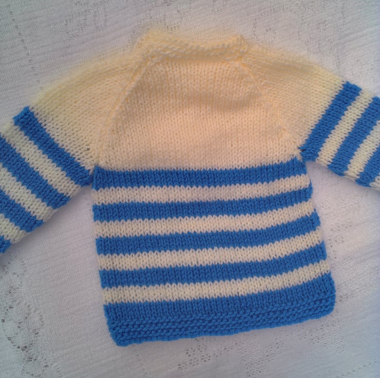 The sweater is in stock to fit a 0 - 3 month old baby with a 16 inch chest, in the shades of blue and white shown in the photos. It would make an ideal gift for a baby shower, a new born baby or as a Christening gift. It would also look good on your own little one as a treat for him or her.