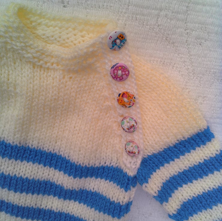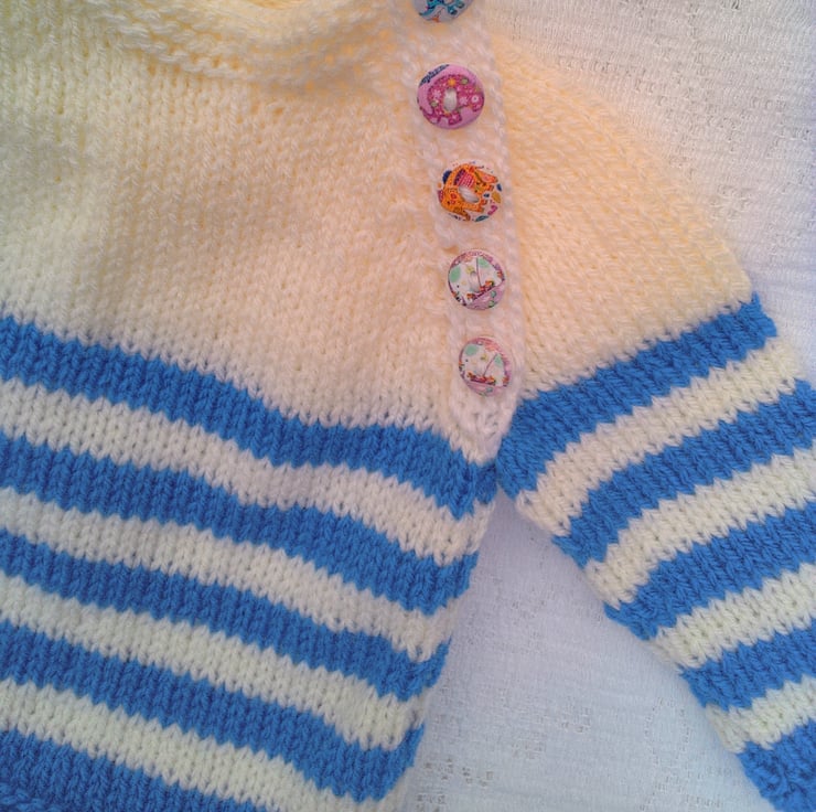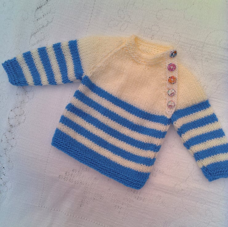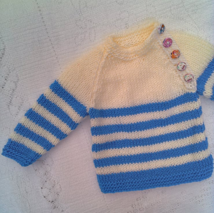 This blue and white striped jumper for a baby is hand knitted in double knitting yarn. It has a 5 button fastening on the front shoulder to make it easier to put on and take off your little one. The buttons are wooden with pictures of elephants.