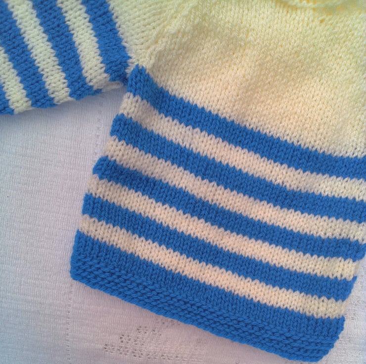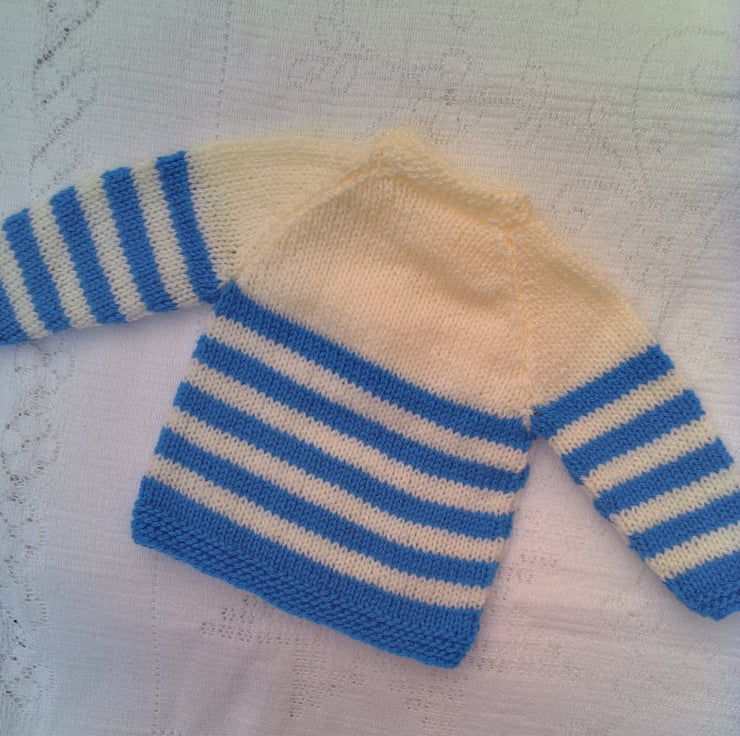 The sweater is in stock to fit a 0 - 3 month old baby with a 16 inch chest, in the shades of blue and white shown in the photos. It would make an ideal gift for a baby shower, a new born baby or as a Christening gift. It would also look good on your own little one as a treat for him or her.