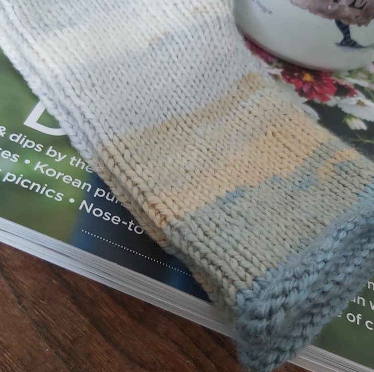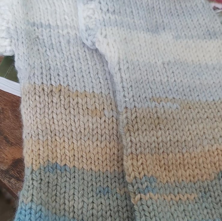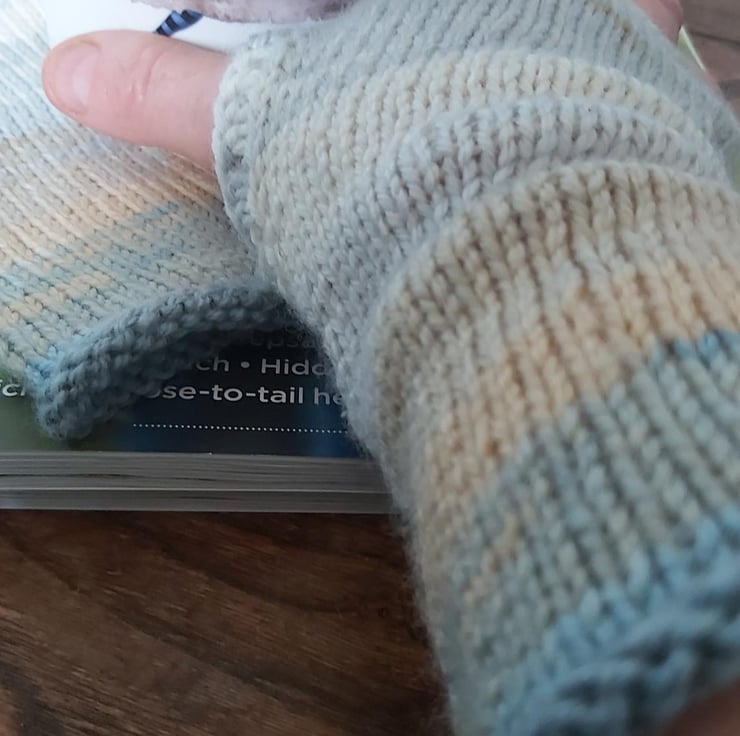 Ideal for chilly nights or when being creative to keep hands warm. These gloves are knitted in a very soft, varigated, double knit wool which is 80% acrylic 20% wool, from Sirdar spirit wool. The colours move from blue gradually through green, yellow, mustard, grey, cream to grey again finishing with a plain band no finger gaps to fight with. The thumb space is crocheted. the seams are lightly whipped together avoiding bulk. the bottom naturally curls. I have tried to make these varigated gloves match accross the pattern as much as the wool would allow but variation can occur as part of the charm.